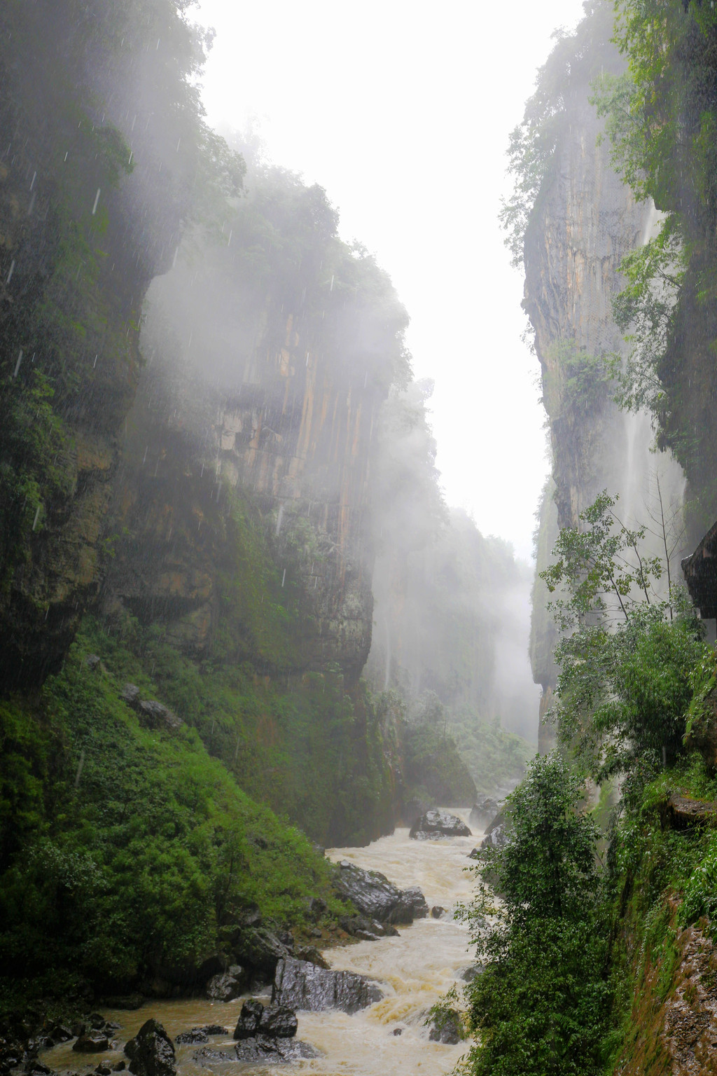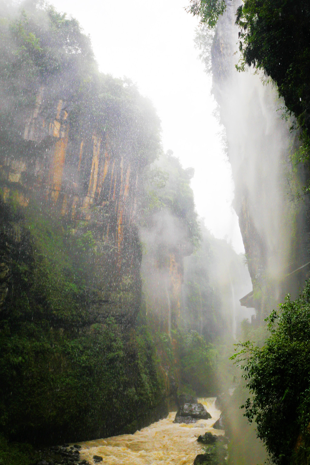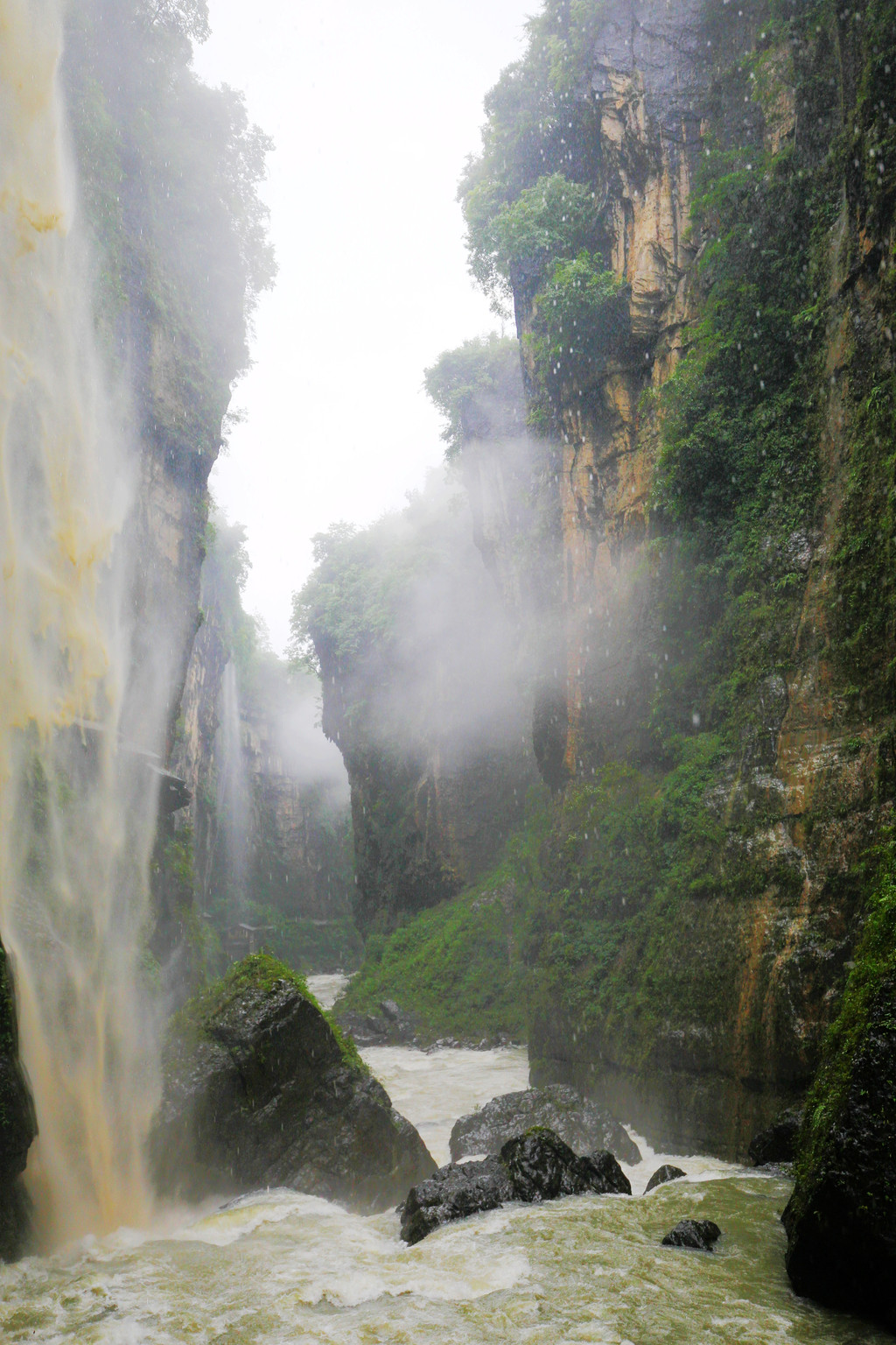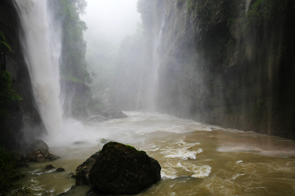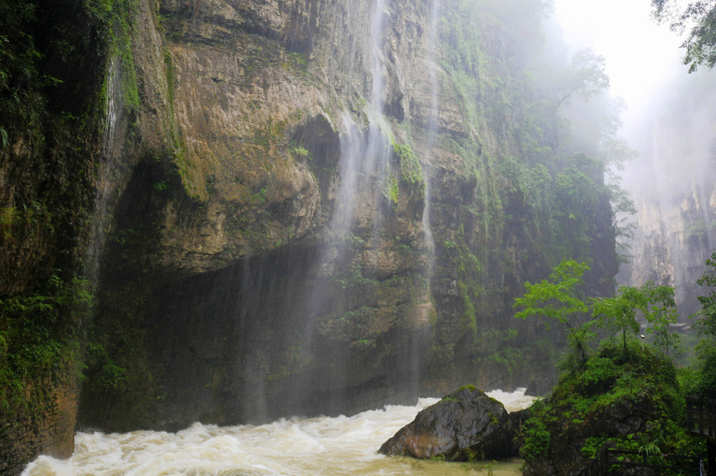 从这里冒雨下到云龙地缝景区。这里号称是地球最美丽的伤痕,全长3.6千米、平均深75米,平均宽15米,两岸陡峭,飞瀑狂泻,由于暴雨,缝底流水惊涛拍岸,无数瀑布从头顶落下,雨水混合着瀑布的飞沫把我们全身浇了个透。