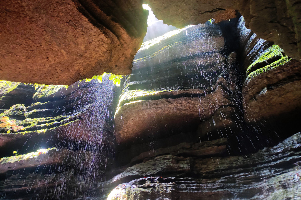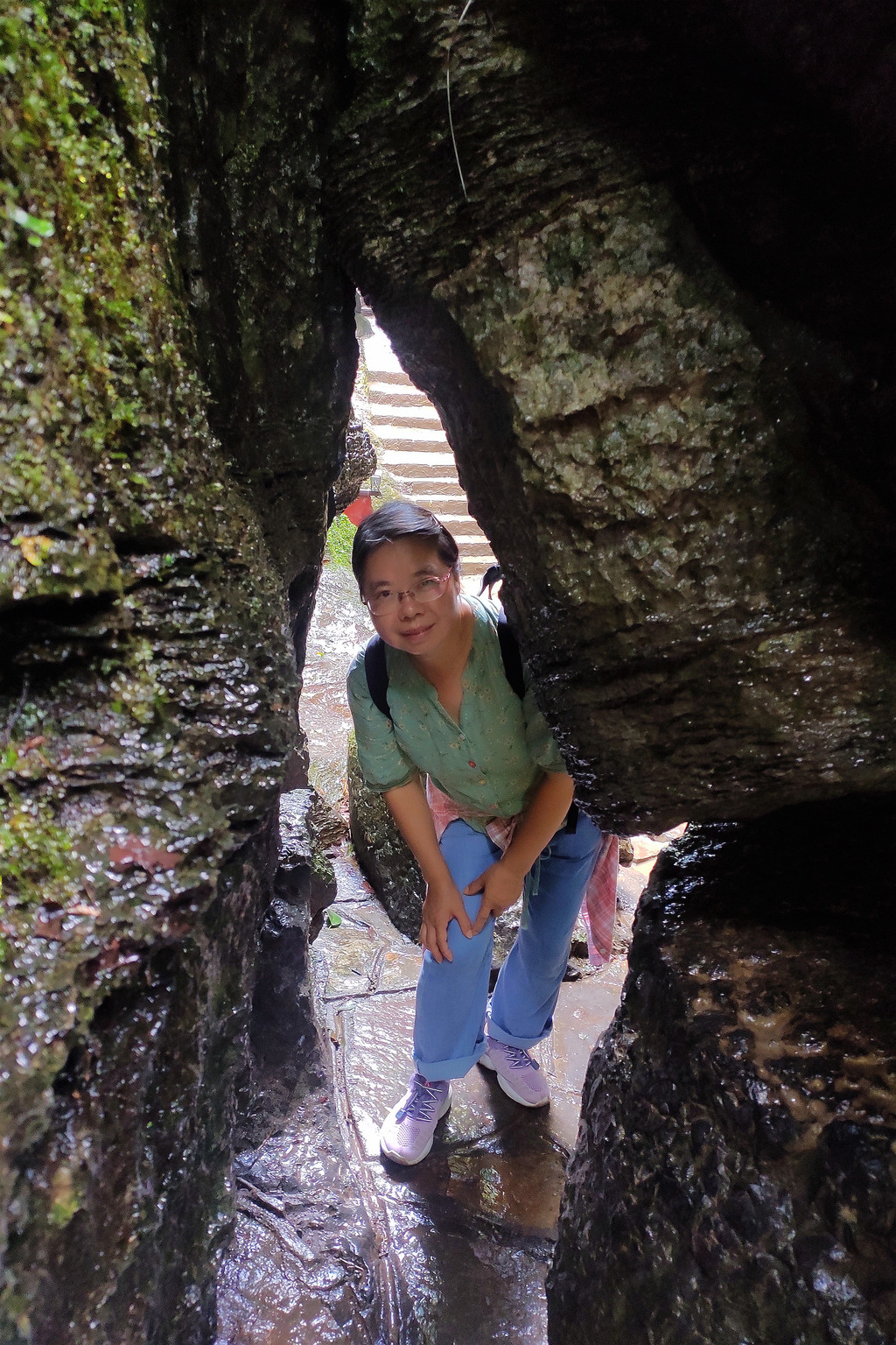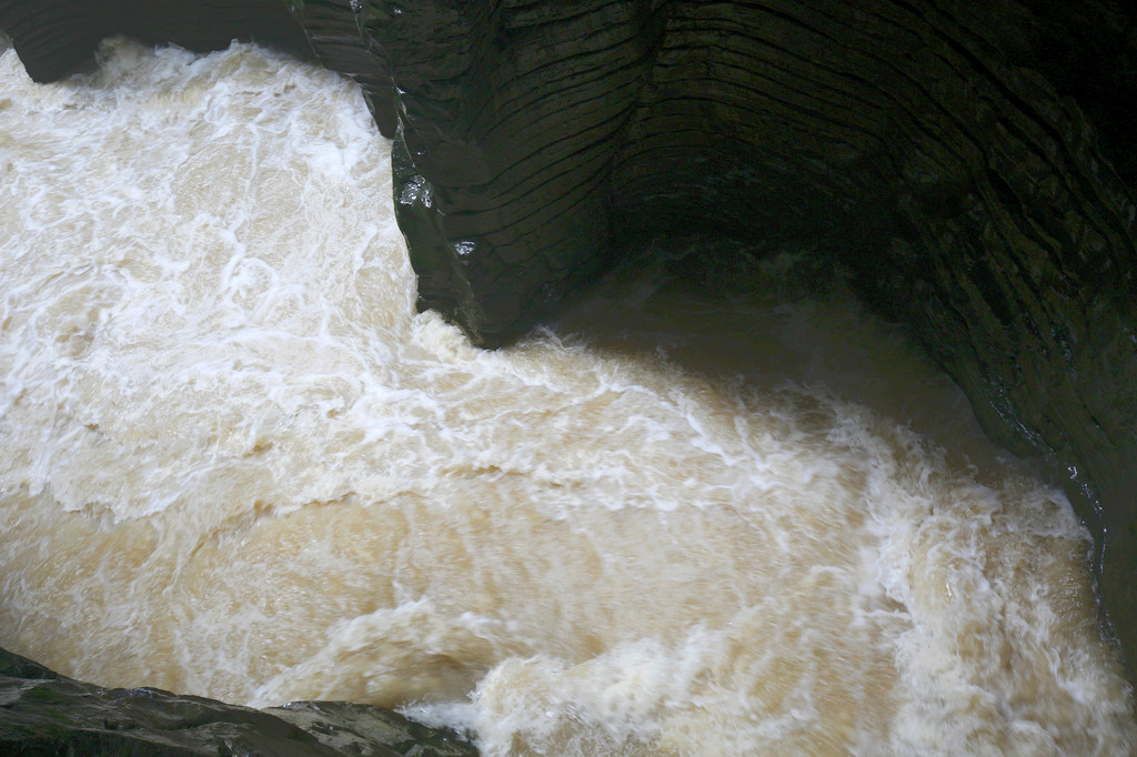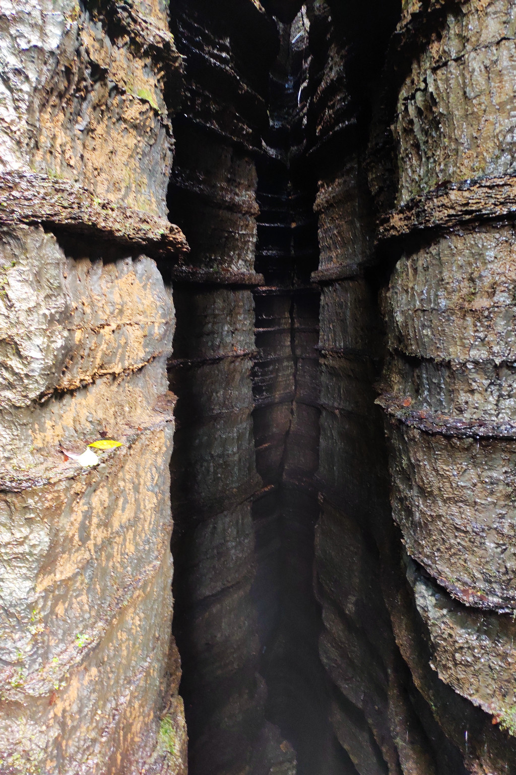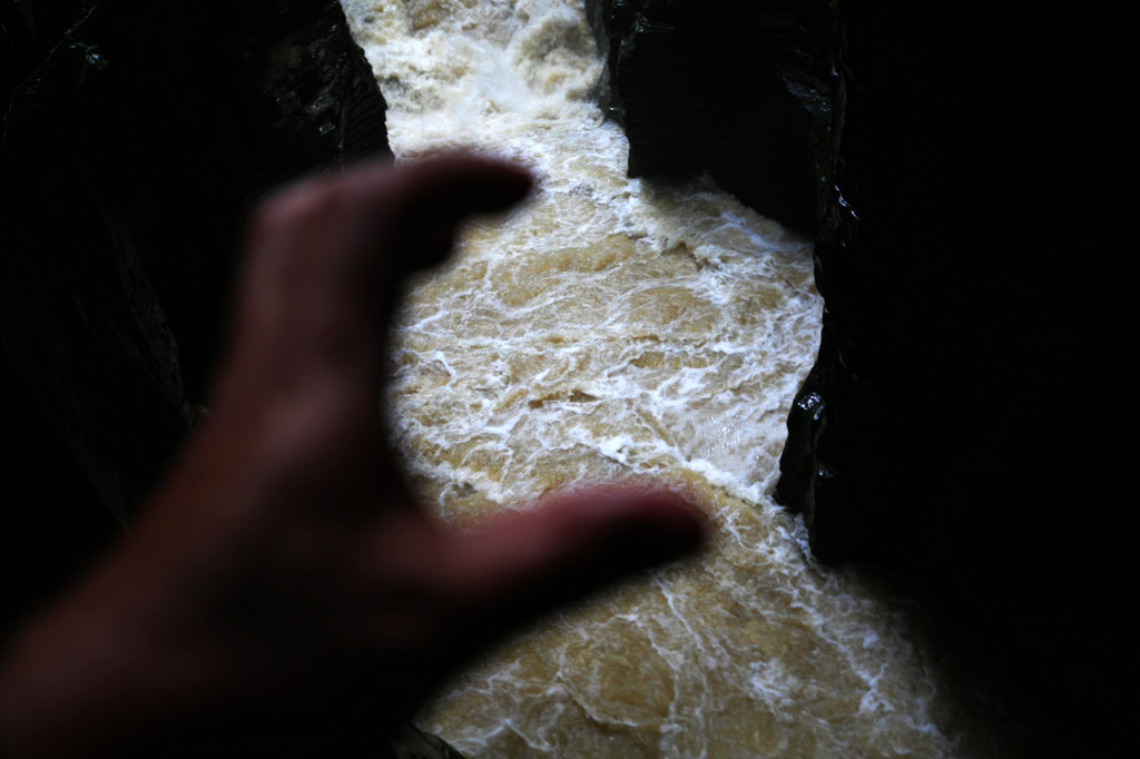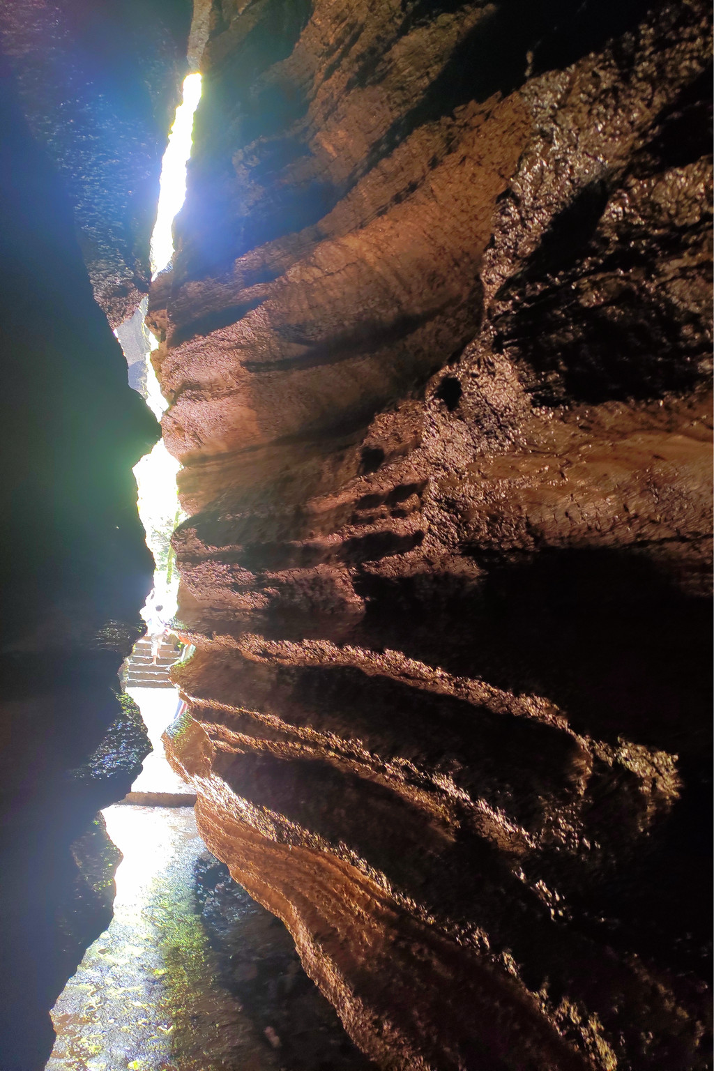 从这里冒雨下到云龙地缝景区。这里号称是地球最美丽的伤痕,全长3.6千米、平均深75米,平均宽15米,两岸陡峭,飞瀑狂泻,由于暴雨,缝底流水惊涛拍岸,无数瀑布从头顶落下,雨水混合着瀑布的飞沫把我们全身浇了个透。