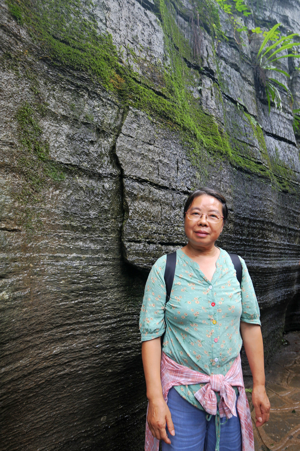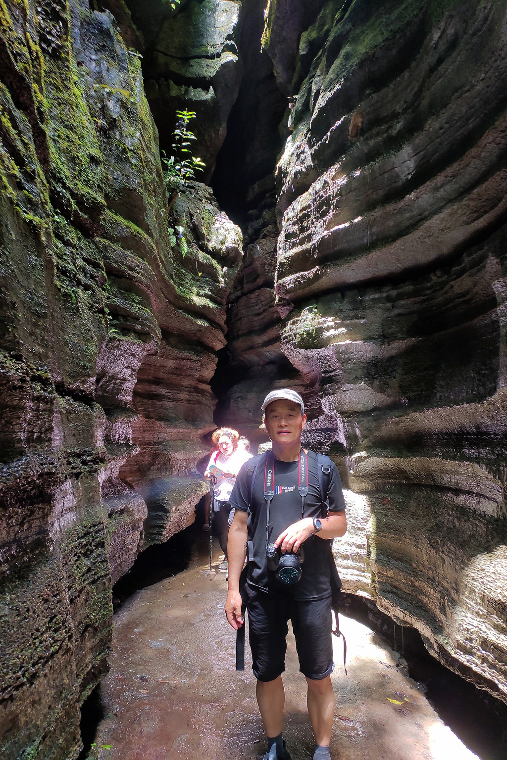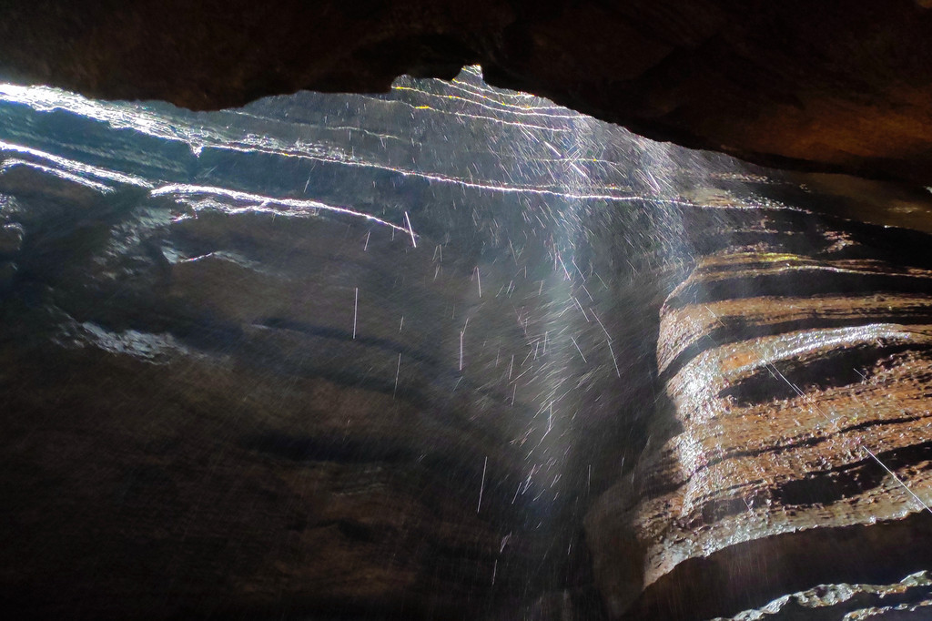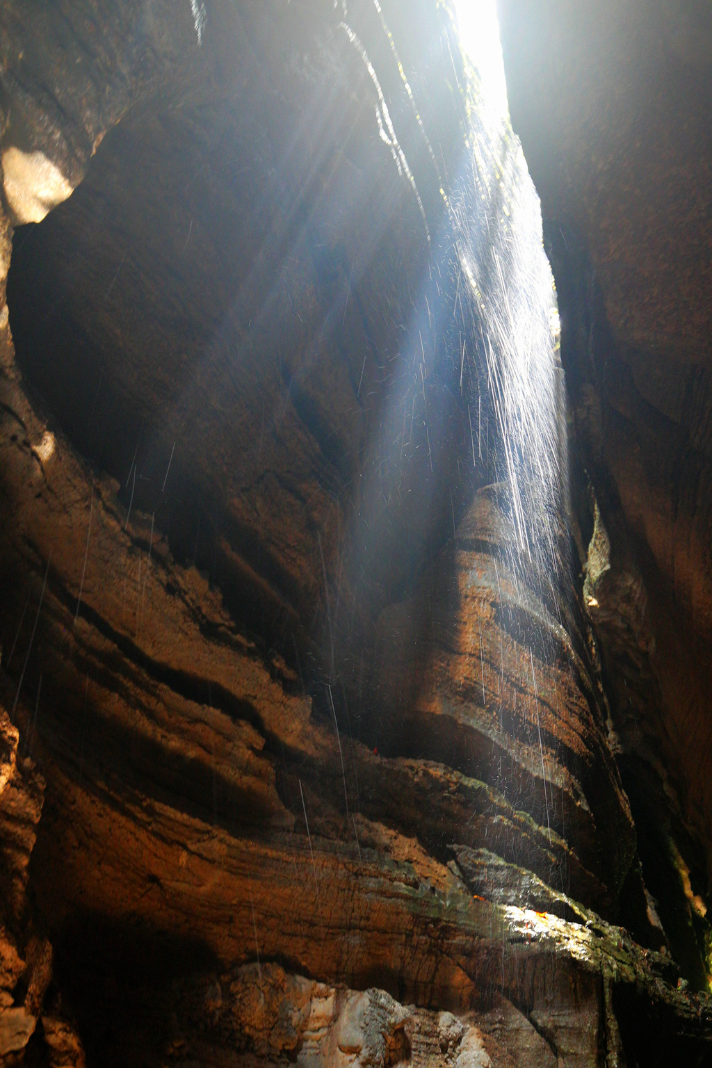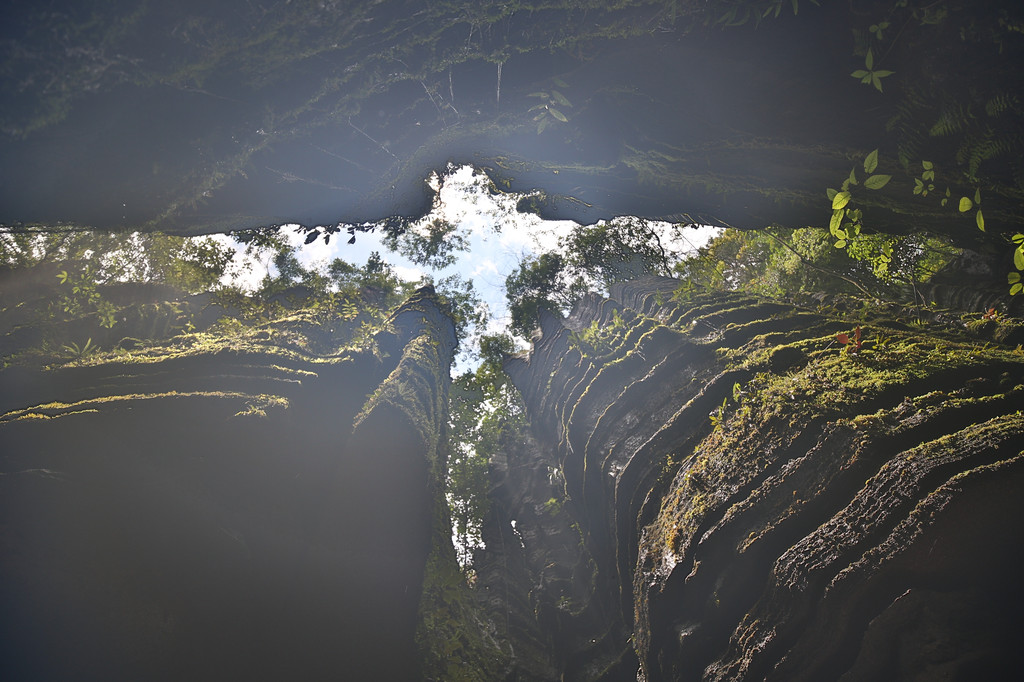 从这里冒雨下到云龙地缝景区。这里号称是地球最美丽的伤痕,全长3.6千米、平均深75米,平均宽15米,两岸陡峭,飞瀑狂泻,由于暴雨,缝底流水惊涛拍岸,无数瀑布从头顶落下,雨水混合着瀑布的飞沫把我们全身浇了个透。