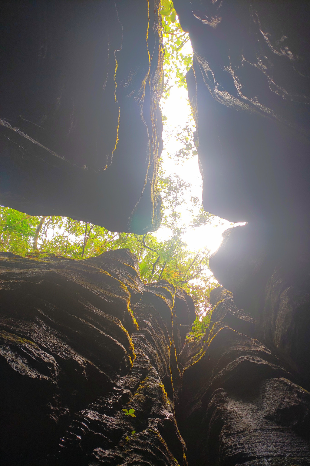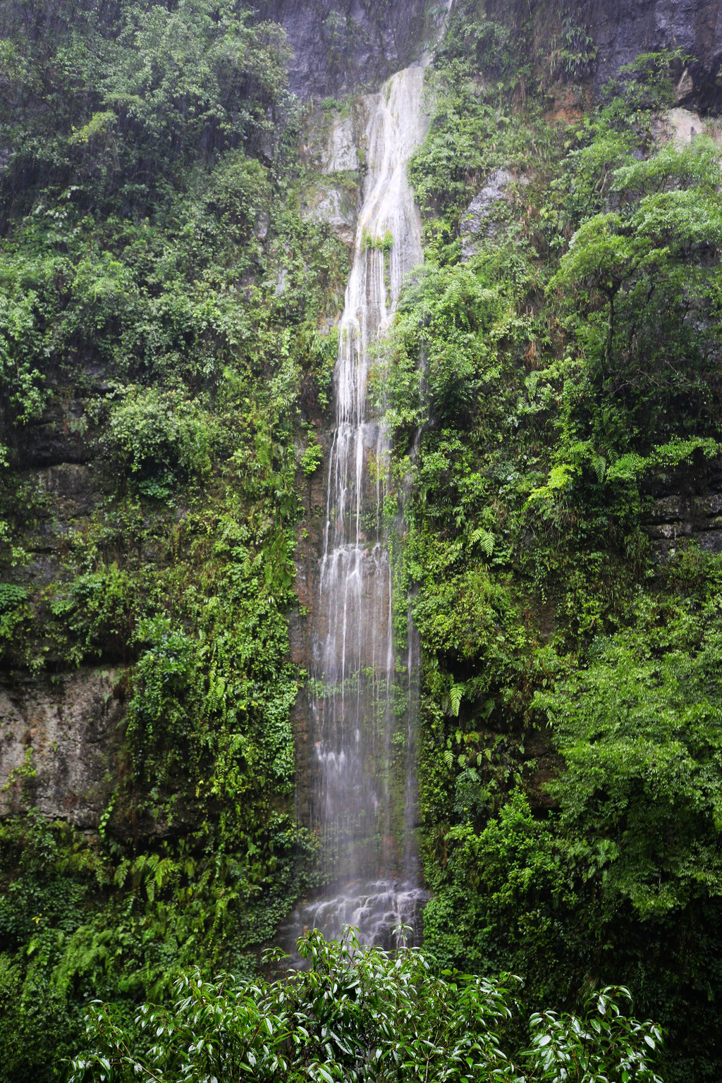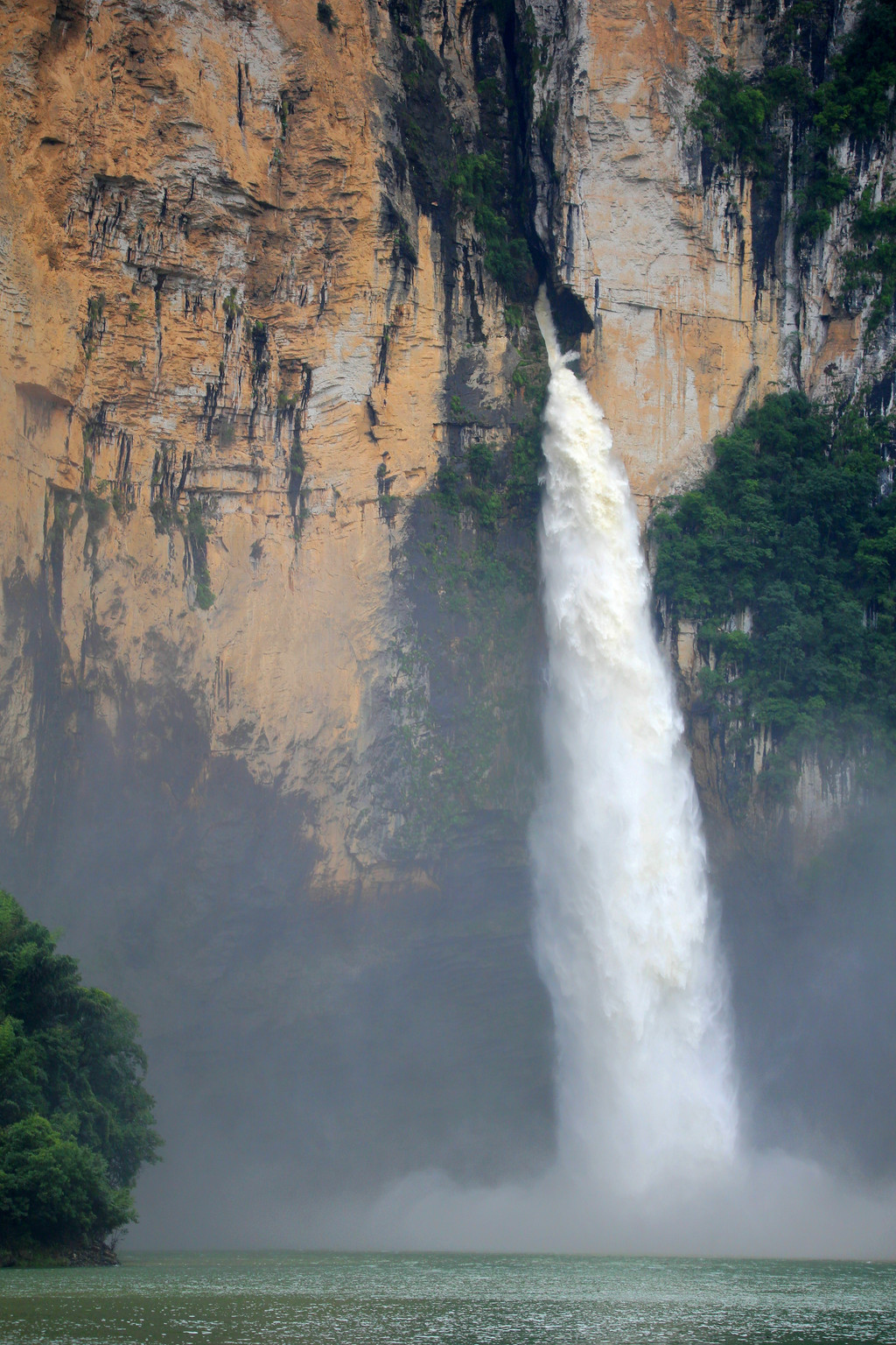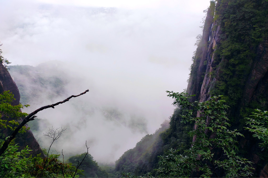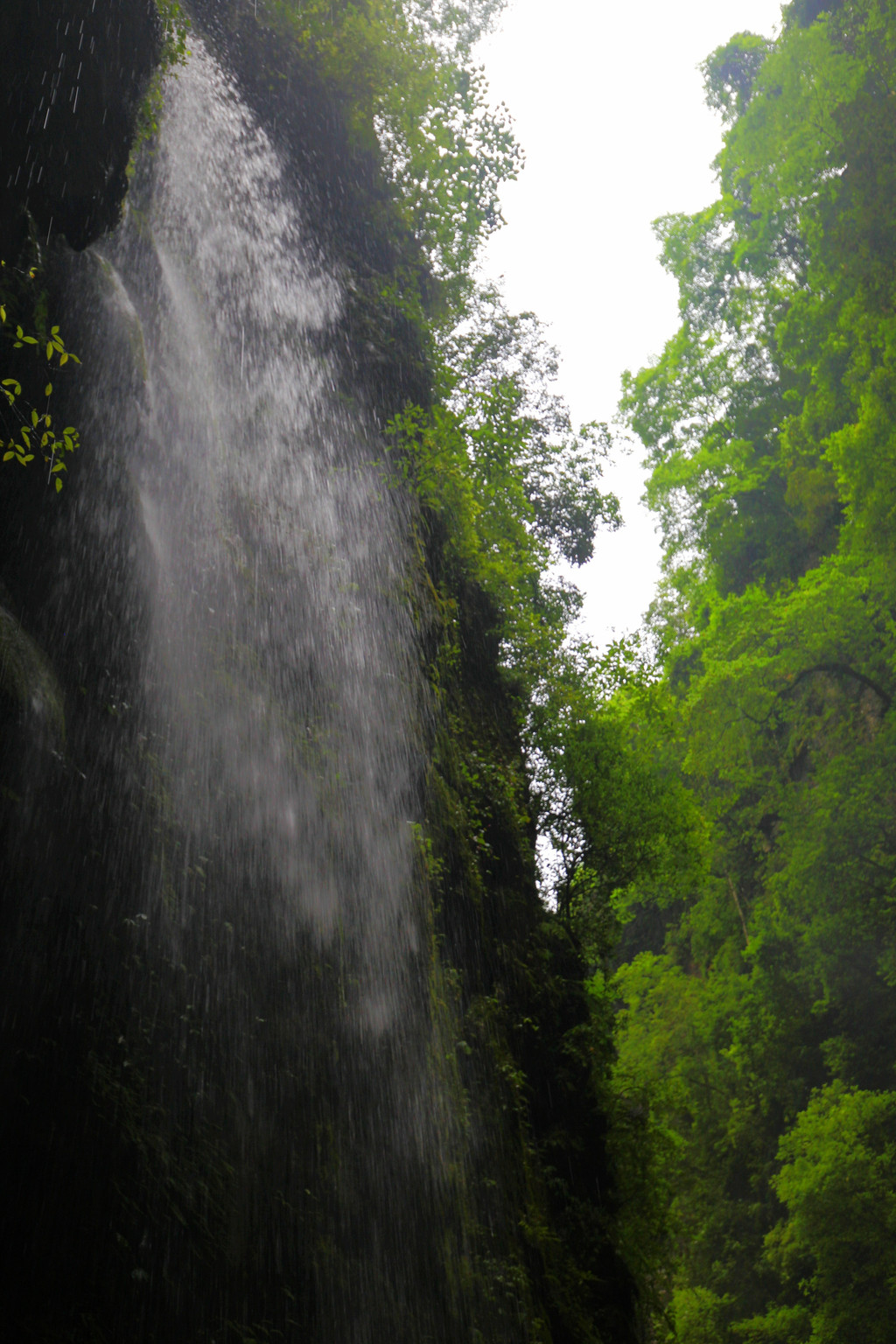 从这里冒雨下到云龙地缝景区。这里号称是地球最美丽的伤痕,全长3.6千米、平均深75米,平均宽15米,两岸陡峭,飞瀑狂泻,由于暴雨,缝底流水惊涛拍岸,无数瀑布从头顶落下,雨水混合着瀑布的飞沫把我们全身浇了个透。