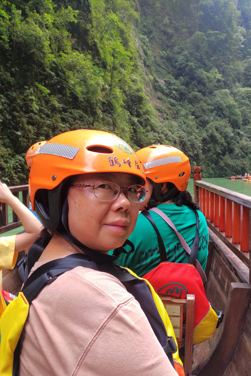 导游下午2:30就催促我们排队等游船了,我们排了35分钟,终于上了游船。戴上安全帽,穿上救生服,坐上小船,随着船公启动马达,小船离开岸边缓缓行驶在碧绿的水中。看吧,水是绿的,周围的树和草也是绿的,我们仿佛进入了爱丽丝梦游仙境。水面时宽时窄,宽的地方几条小船可以并驾齐驱。当船行到水面最窄处时,这时只能容一条小船竖着通过,两岸高高的峭壁像刀斧劈过一样光秃秃地矗立着,最高处似乎要接连在一起只留下一线天,不停从四周崖壁上滴落的颗颗水珠,被上面漏射下来的几缕金色阳光照射,一瞬间仿佛大珠小珠落玉盘。