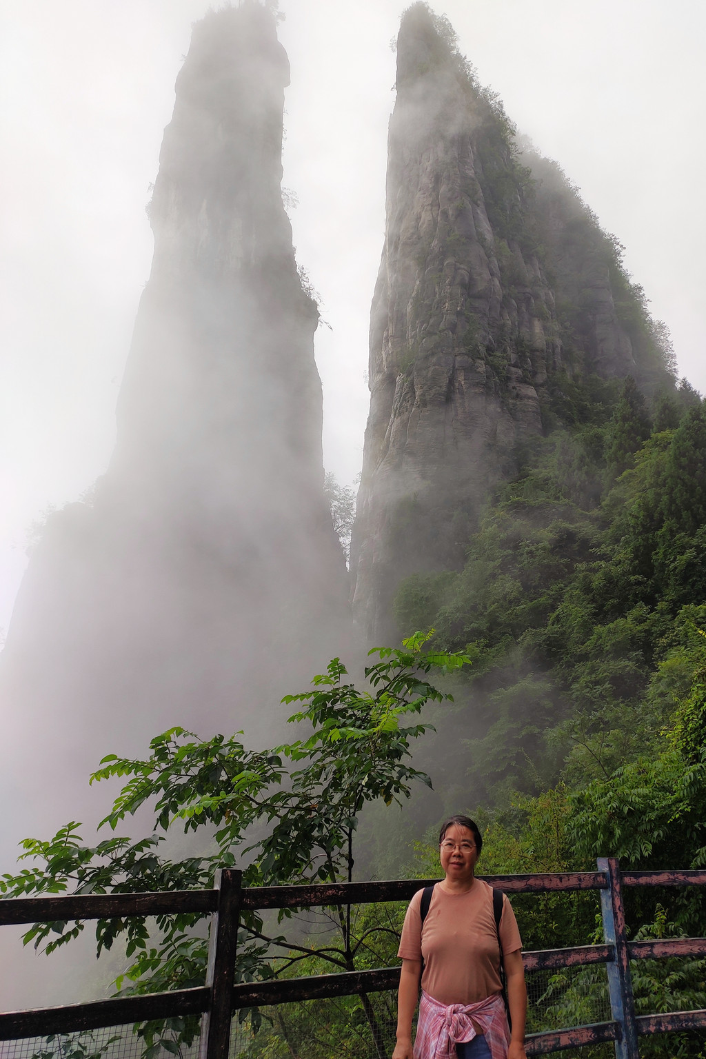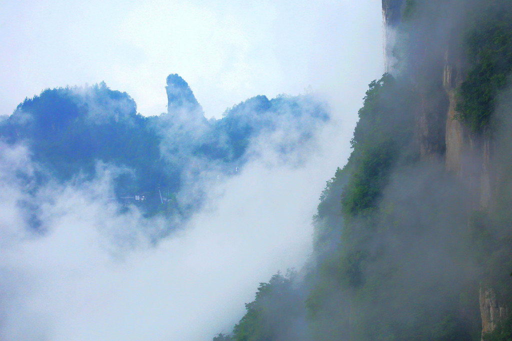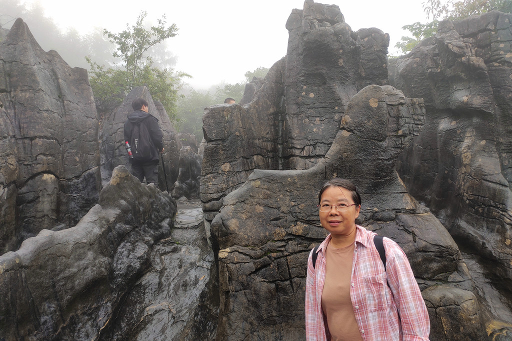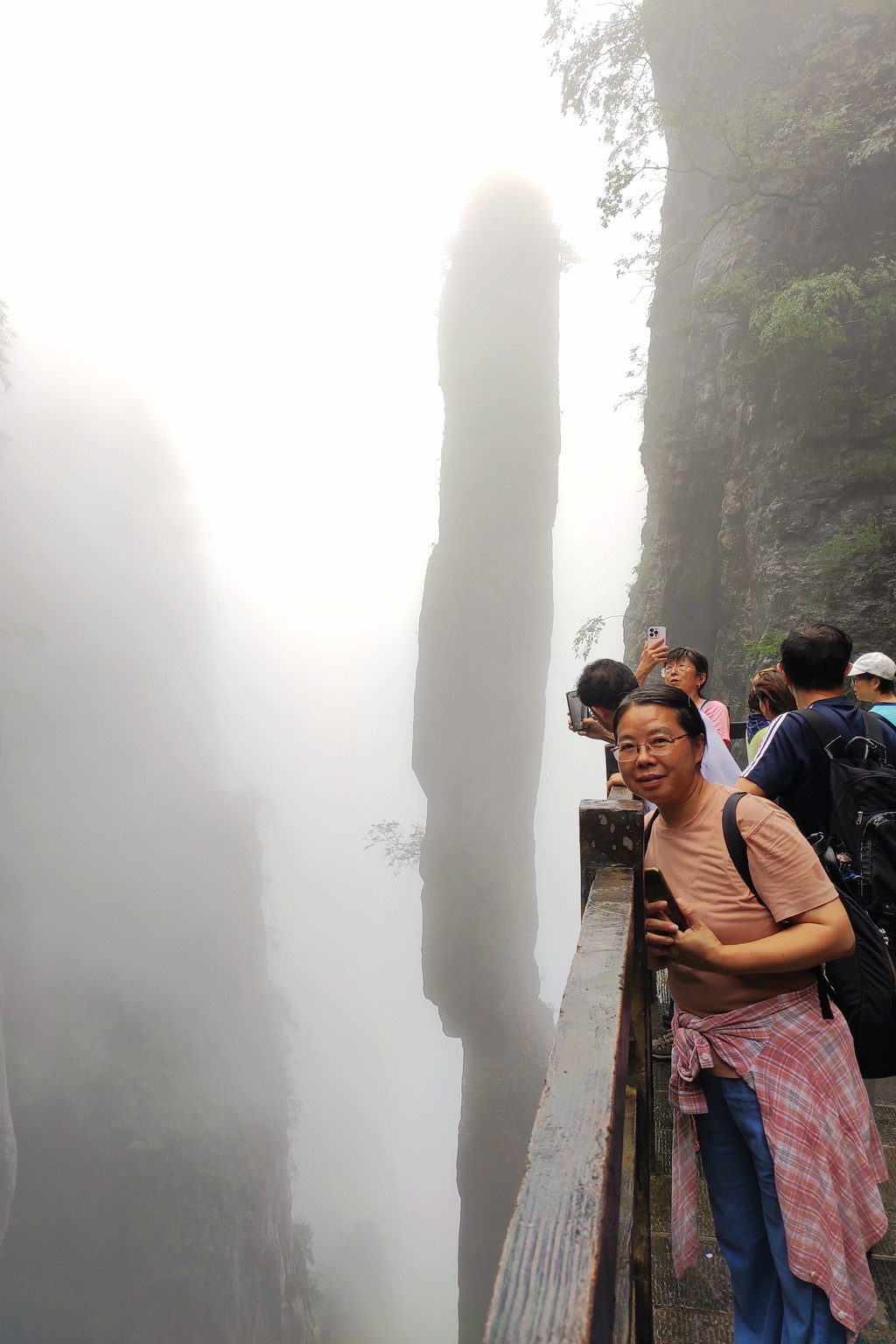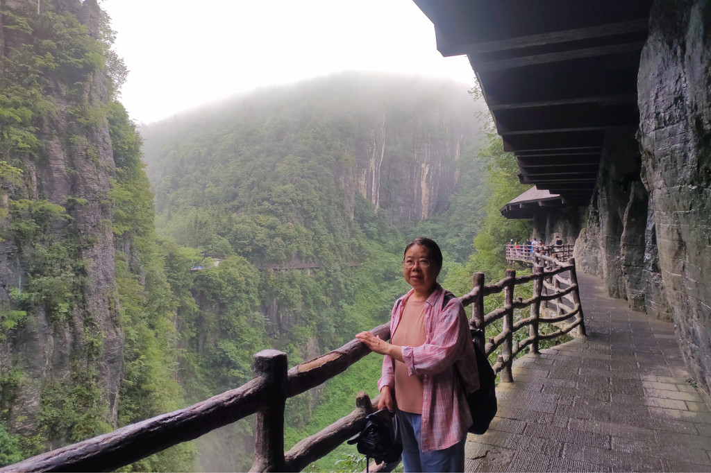 我们一路沿着石芽迷宫、悬棺高升、一线天、绝壁栈道、中楼门服务点、回音谷、峡谷轩酒店、迎客松、一炷香、大地山川、母子情深、玉笔峰、电动扶梯至出口。峡谷中人工挖凿搭建的“绝壁栈道”,穿梭在山腰间,脚下就是万丈深渊,因为雾气弥漫,我们没有体会到一丝丝惊险。