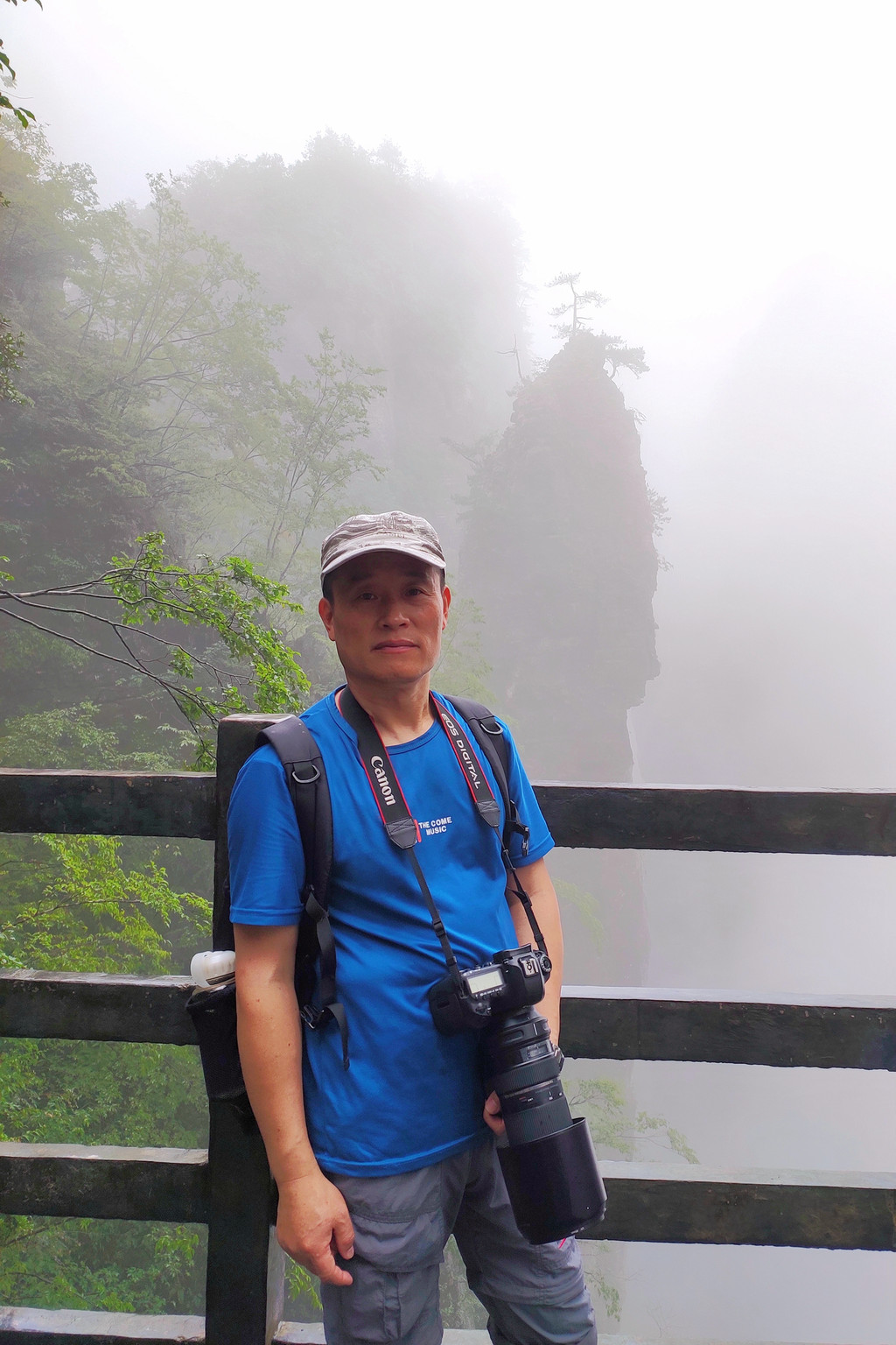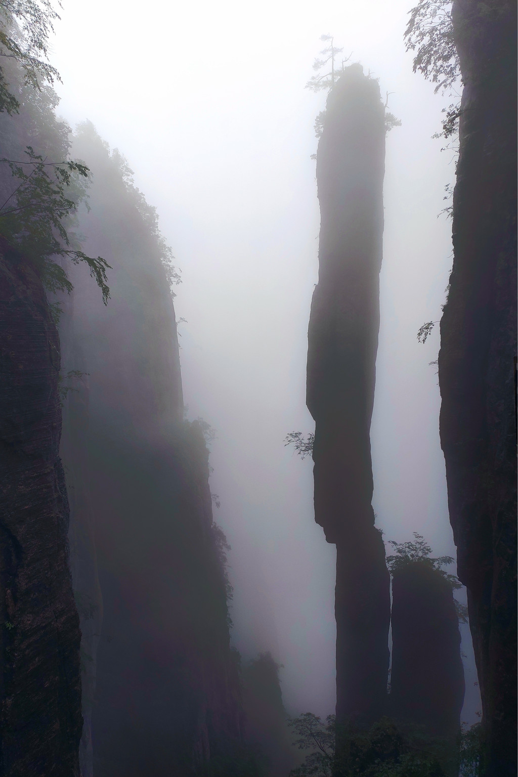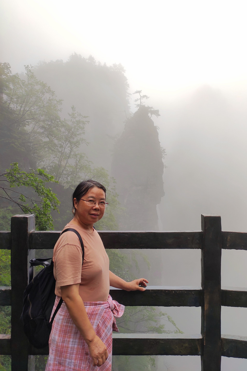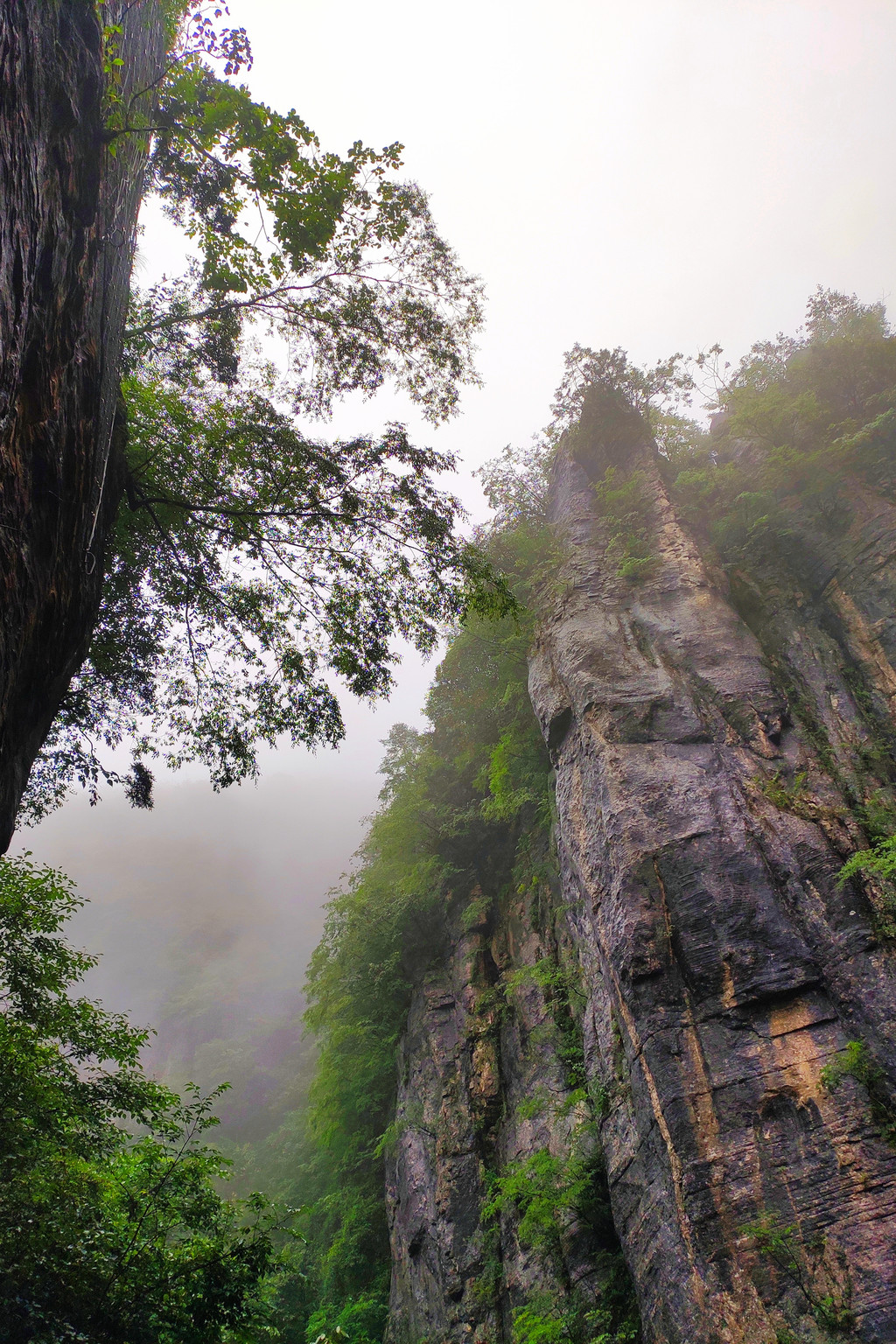 我们一路沿着石芽迷宫、悬棺高升、一线天、绝壁栈道、中楼门服务点、回音谷、峡谷轩酒店、迎客松、一炷香、大地山川、母子情深、玉笔峰、电动扶梯至出口。峡谷中人工挖凿搭建的“绝壁栈道”,穿梭在山腰间,脚下就是万丈深渊,因为雾气弥漫,我们没有体会到一丝丝惊险。