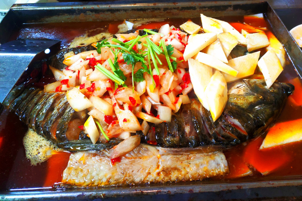 导游提前预定了“土司烤活鱼”,我们到了以后省去了一点时间,这里烤鱼是108元一条,大概3、4斤重,我们要的是酸辣口味的,配菜我们点的是山药。由于炭火太旺,吃得我们满头大汗,赶紧让老板把炭火提前撤了。