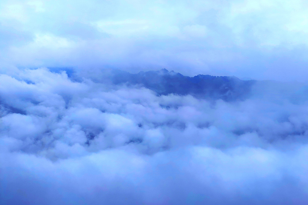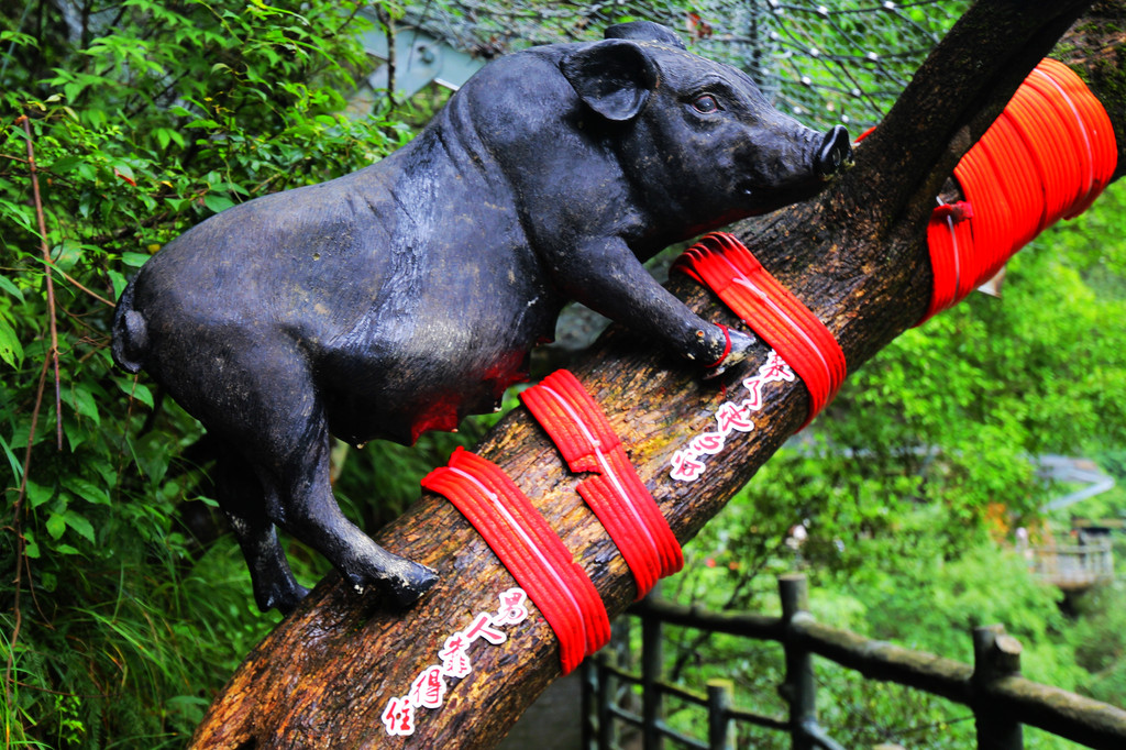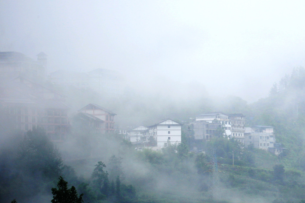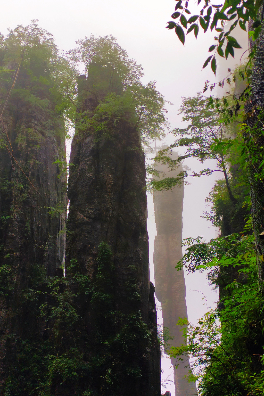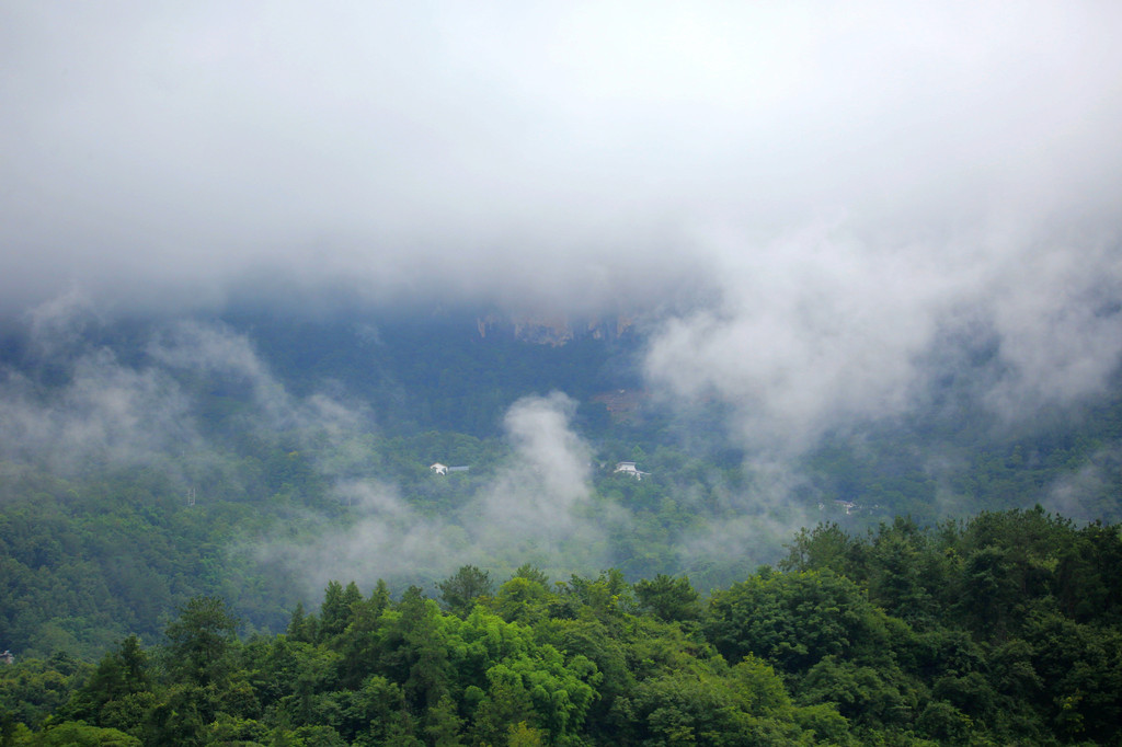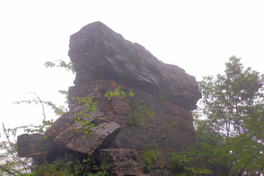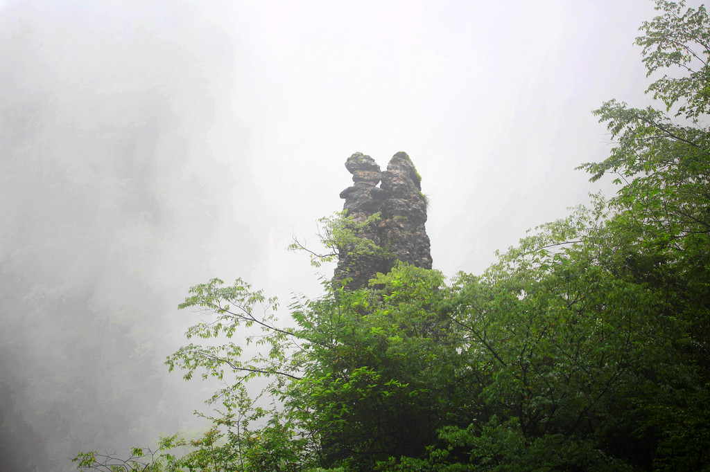 我们直接乘坐105元的上行索道来到了山顶的七星寨。今天运气不佳的是,雨一直很大,山顶四周雾气蒙蒙,几米开外就什么也看不见了。