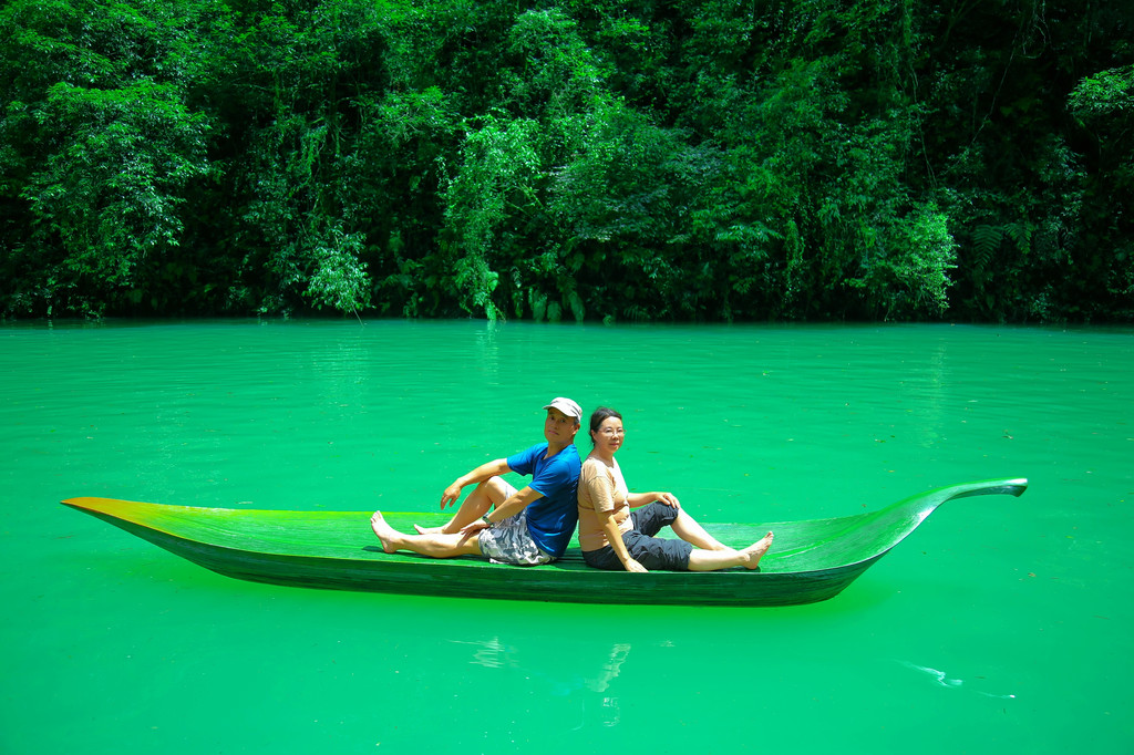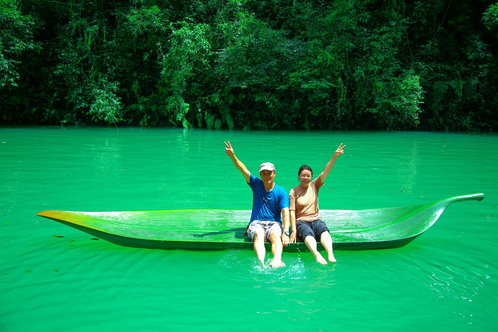 这里被世人誉为“中国仙本那,世外古桃源”。我们一路沿着罡步天梯、步云台,下到谷底的阿打铺子水边,本来准备拍摄198元的悬浮船小视频,因为排队太久,而改成了90元双人两张底片的树叶船。老婆嫌贵,但我认为,千里迢迢赶过来,不拍摄一张悬浮船的照片实在说不过去,虽然今天由于才下完雨没有多久,水有点浑浊,没有悬浮的效果,拍照也是固定模式,但还是值得一拍的,价格也能够承受。