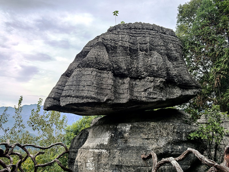 下图是梭布垭三大奇石之一“摇得动”—镇龙玉珠,相传为咿罗娘娘为助廪君,投出随身玉珠镇压恶龙。从“摇得动”的名字可见,玉珠可摇动,但不会掉下来。试着摇了一下,玉珠纹丝不动。