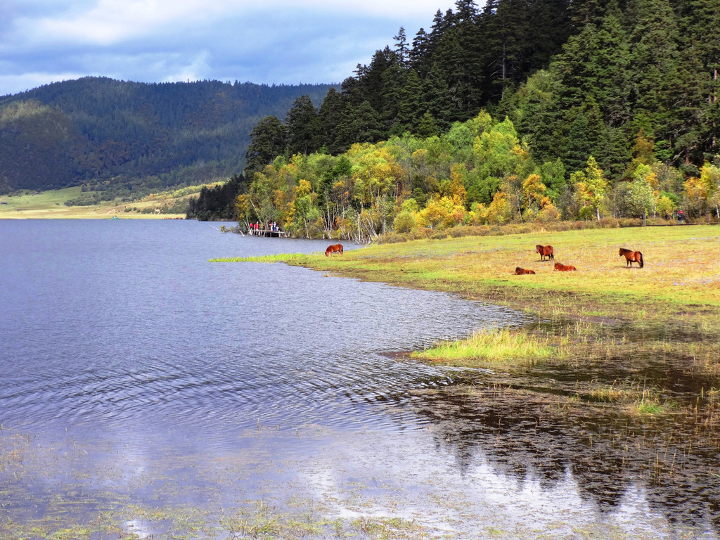 云南的秋还包含着壮阔,层林尽染的树木,倒影在湖面上,像是这片秋色的镜子,远处的雪山,也心甘情愿当起了背景。