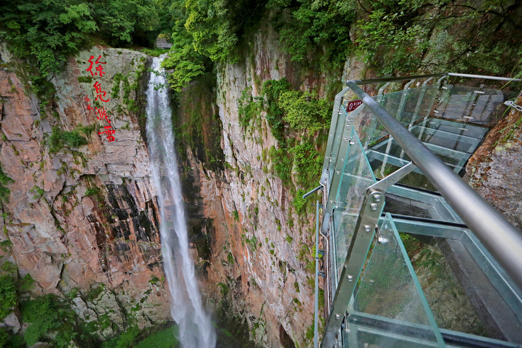 通过玻璃栈道看看徐凫岩瀑布也是一个不错的角度,徐凫岩海拔约500不到,这里的瀑布落差大约在200米左右,但是去瀑布底看来回的山路就要1小时,在玻璃栈道上看简直就是懒人的专利,而且高空的刺激感与视觉的美感交加时,一切恐高都不是事!。