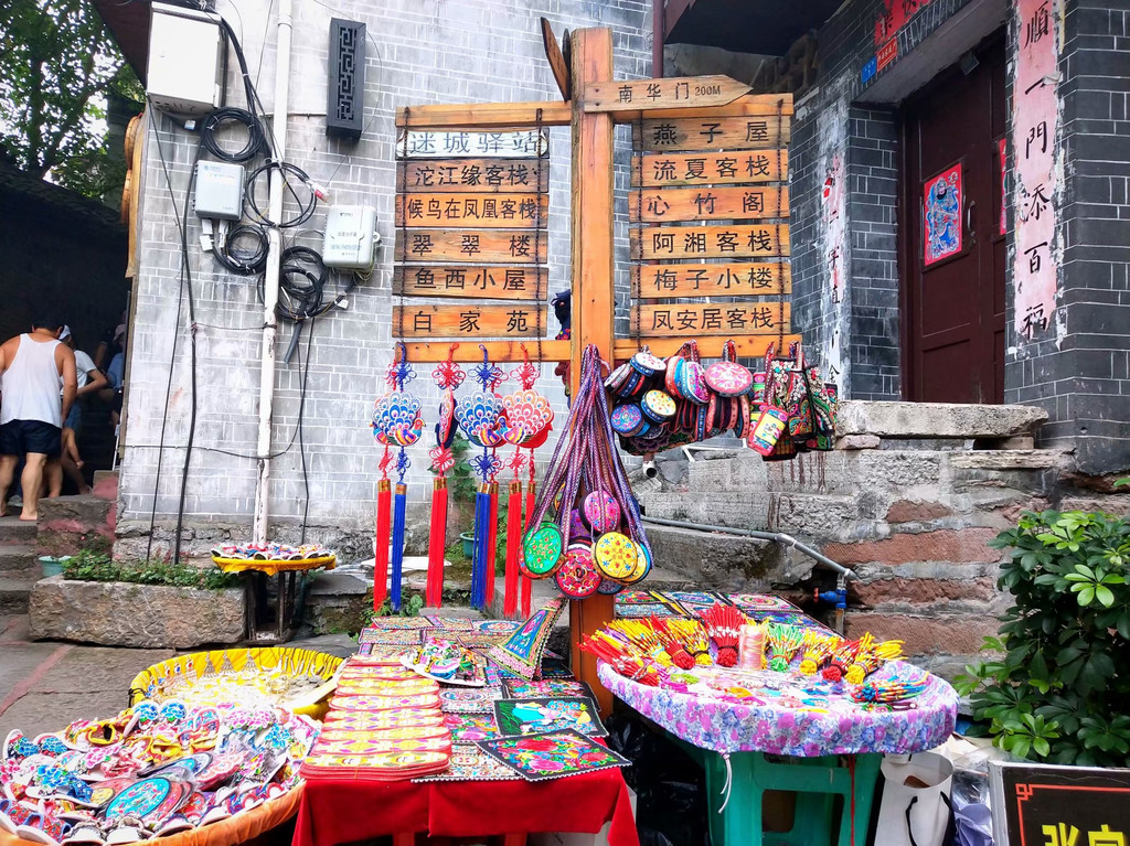 如到西门城楼,也许能遇见“挫花大王”吴六爱老奶奶及擅长打花带的妇人龙玉门。不过因城管加大力度,小摊现多集中在南边街即“民族工艺品一条街”,这里多是民族服饰及特色小店集中地,虽不如东正街和酒吧街那么繁华,却是一个安静的巷子,适合女生闲逛。如果有时间,还可以到凤凰城外赶趟湘西市集,也许能发现些不一样的东西。