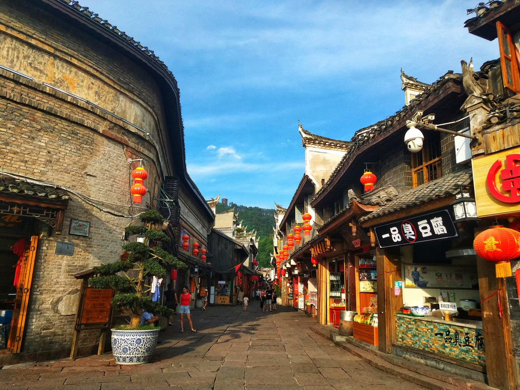 宽不足5米的青石板街,自道门口往西,经十字街、东正街、西正街、回龙阁、营哨冲、陡山喇、接官亭、沈从文墓地直至天下第一泉,全长3000多米。是凤凰最繁华的商业街。