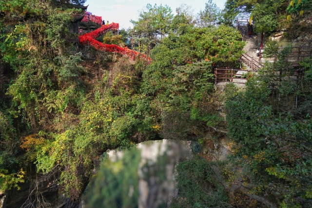 天下第一桥是两座山峰之间行成的一条天然石桥,长20余米,绝对高度350米,不得不感慨大自然的鬼斧神工,真乃旷世奇作。