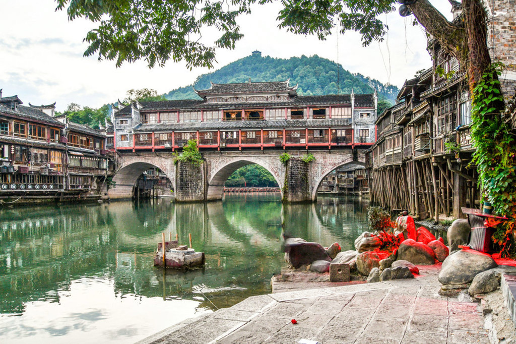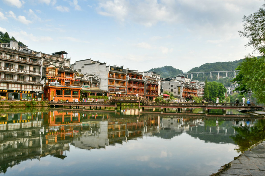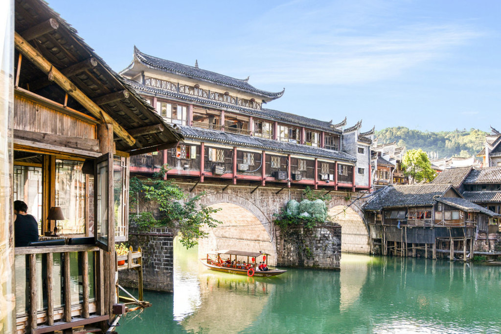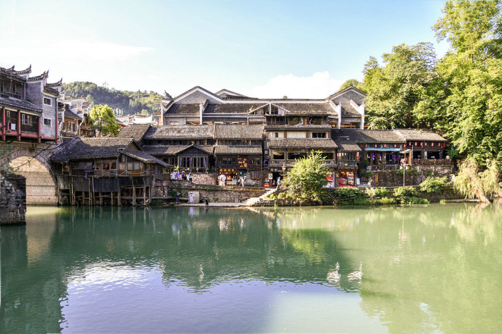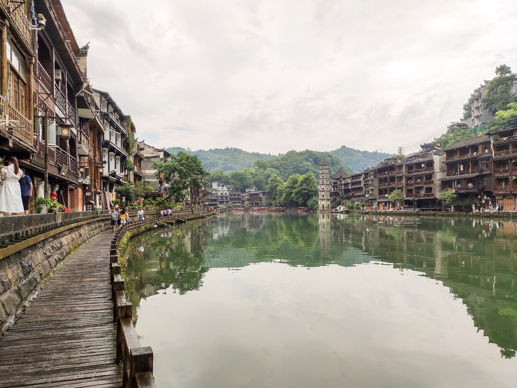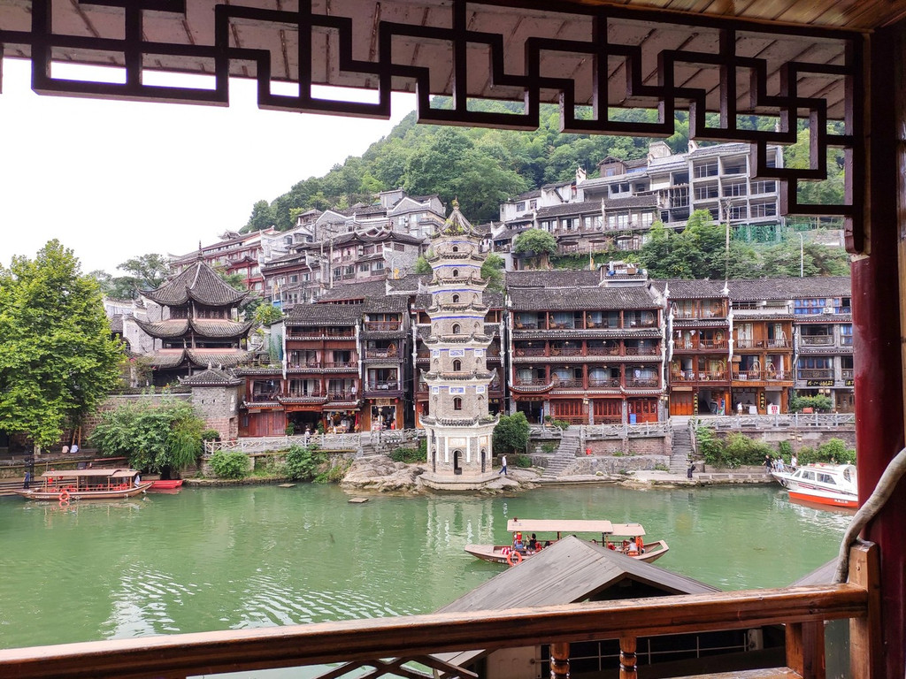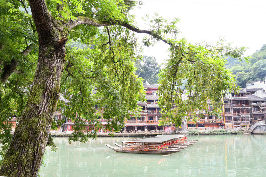 碧绿的沱江之水顺着古城从窗下缓缓流过,吊脚楼倒映在清流之中,时不时有船篷划过,带起一层层涟漪,水中倒影也跟着朝四周悠悠荡开,别有一番水乡风情。