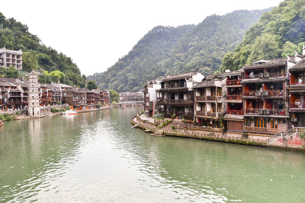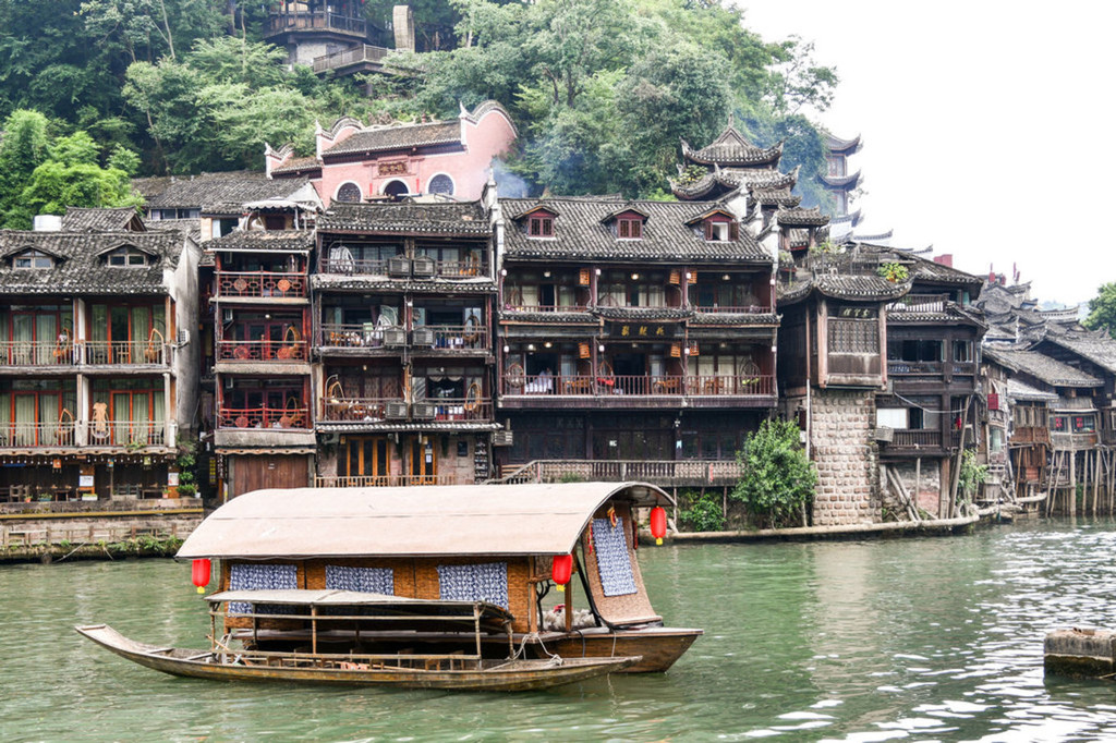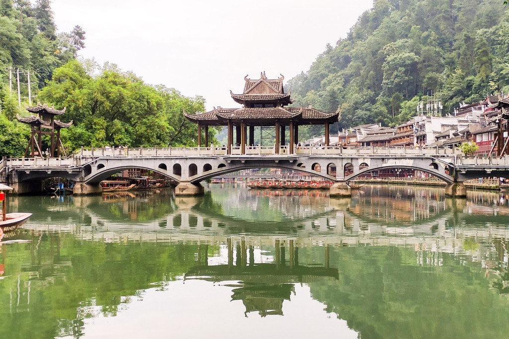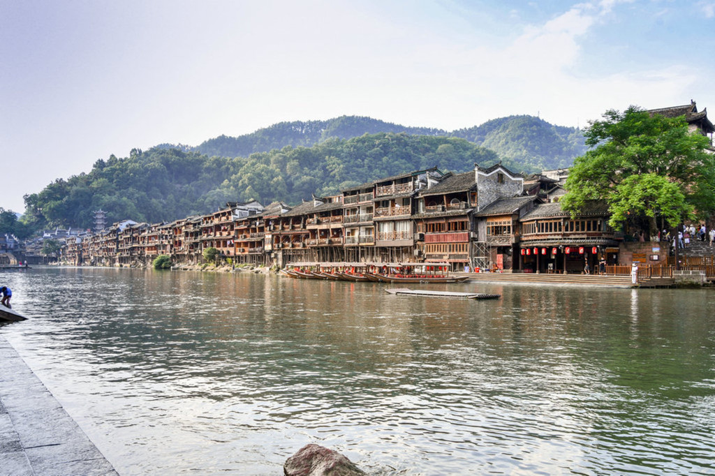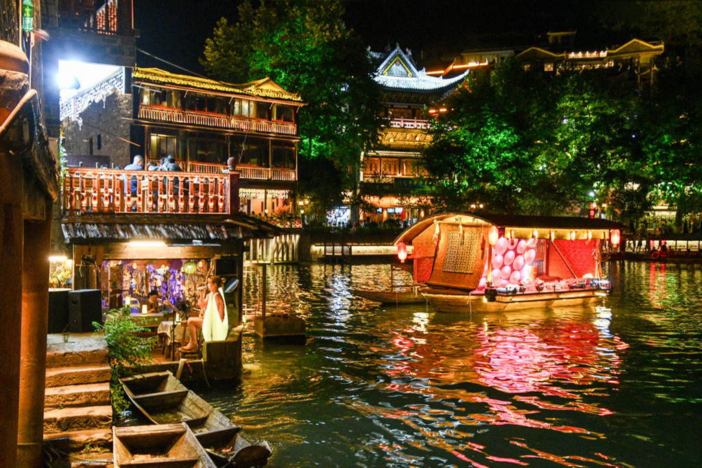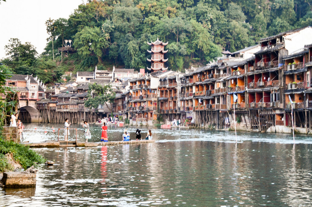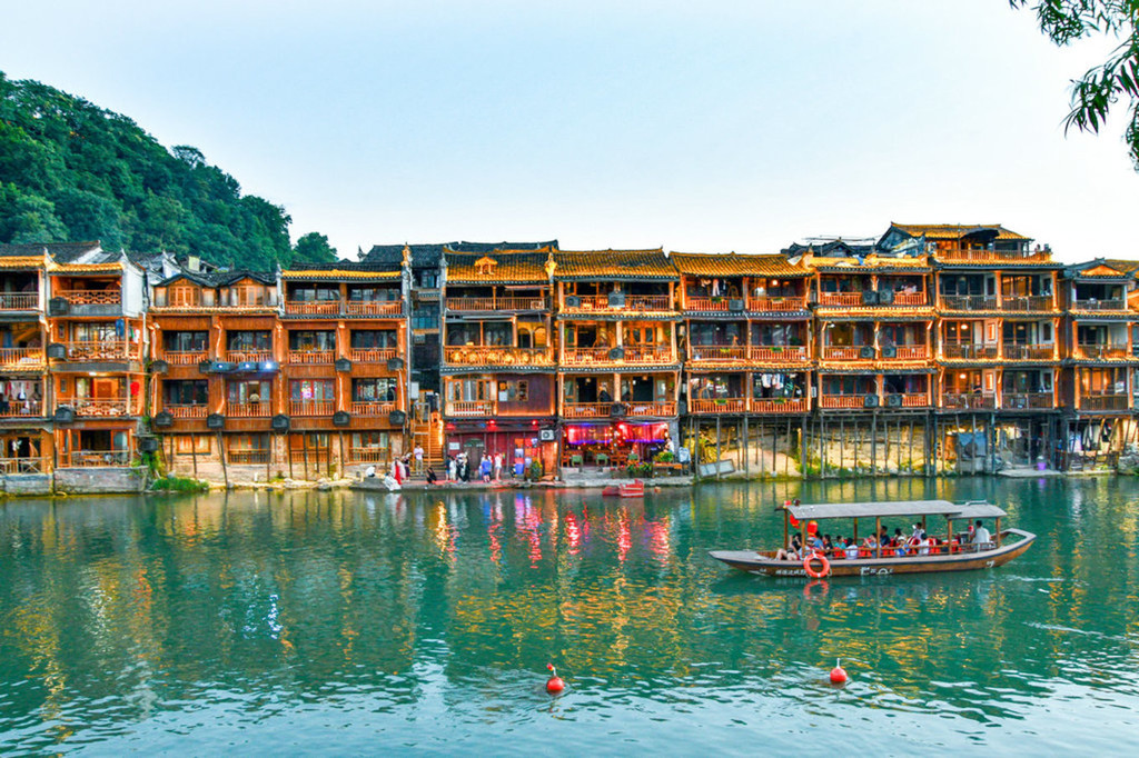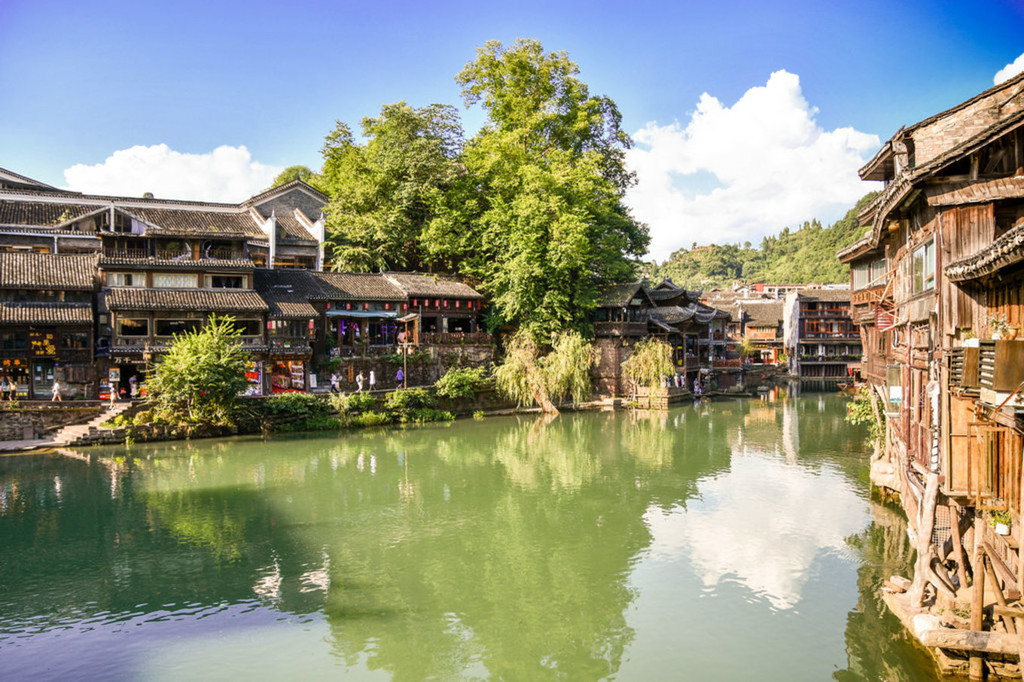 碧绿的沱江之水顺着古城从窗下缓缓流过,吊脚楼倒映在清流之中,时不时有船篷划过,带起一层层涟漪,水中倒影也跟着朝四周悠悠荡开,别有一番水乡风情。