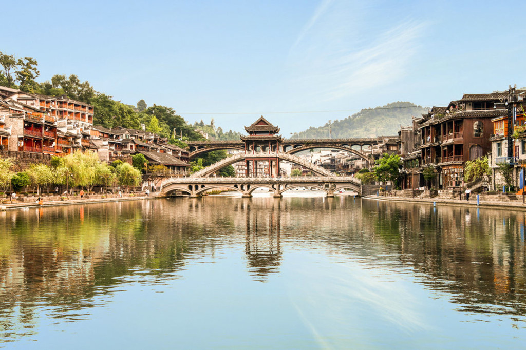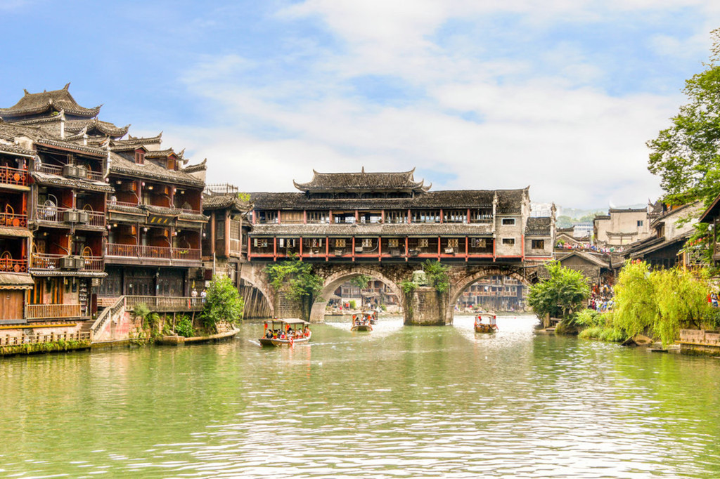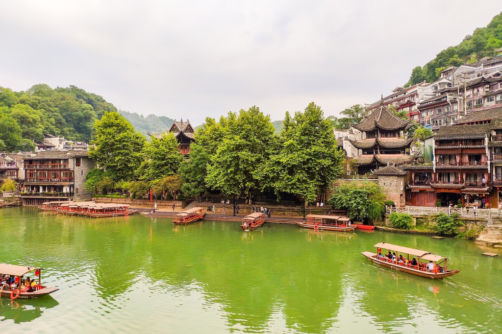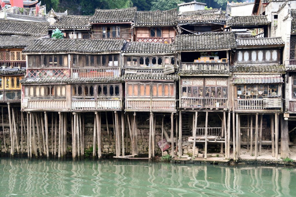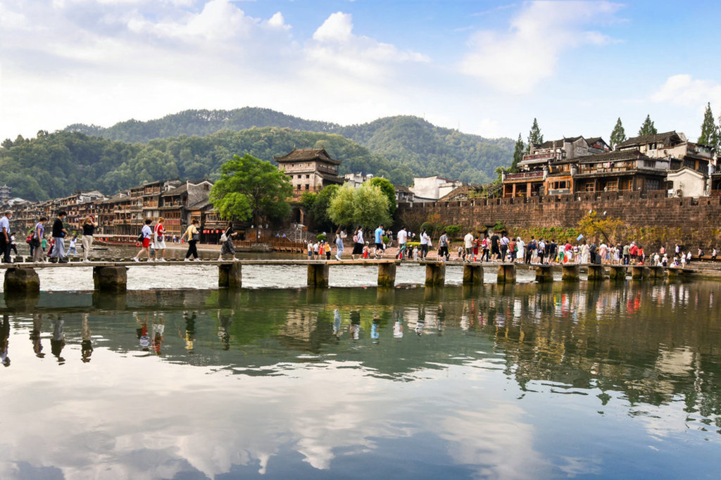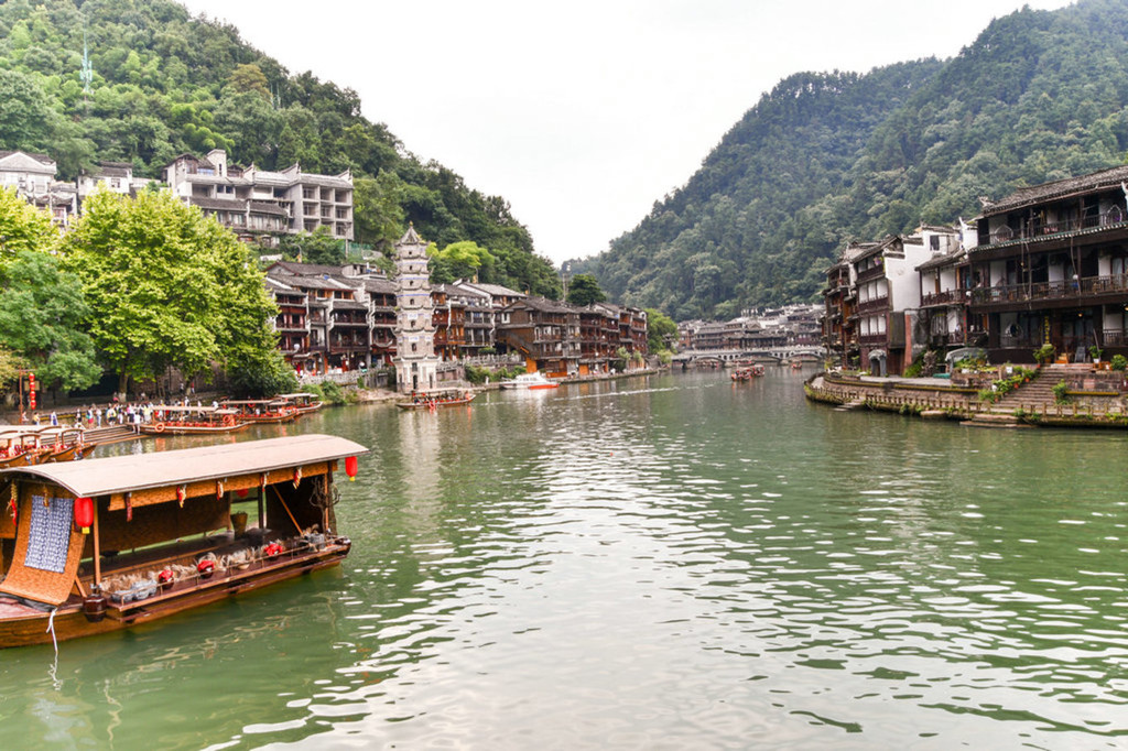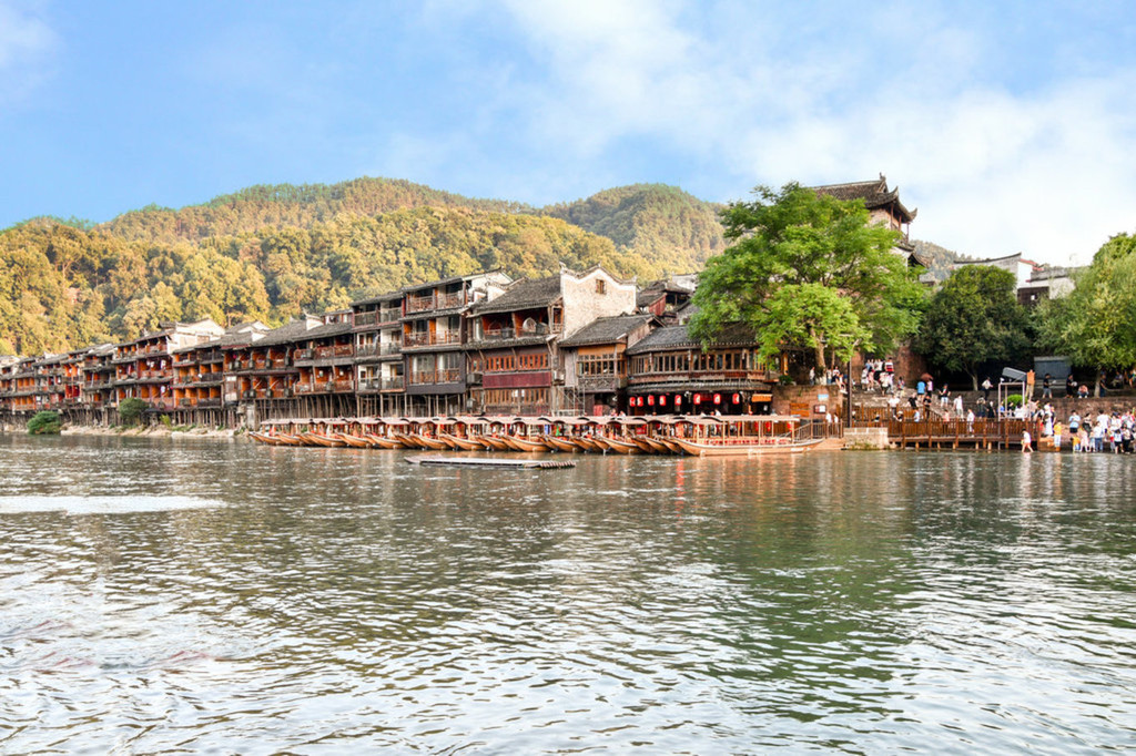 碧绿的沱江之水顺着古城从窗下缓缓流过,吊脚楼倒映在清流之中,时不时有船篷划过,带起一层层涟漪,水中倒影也跟着朝四周悠悠荡开,别有一番水乡风情。