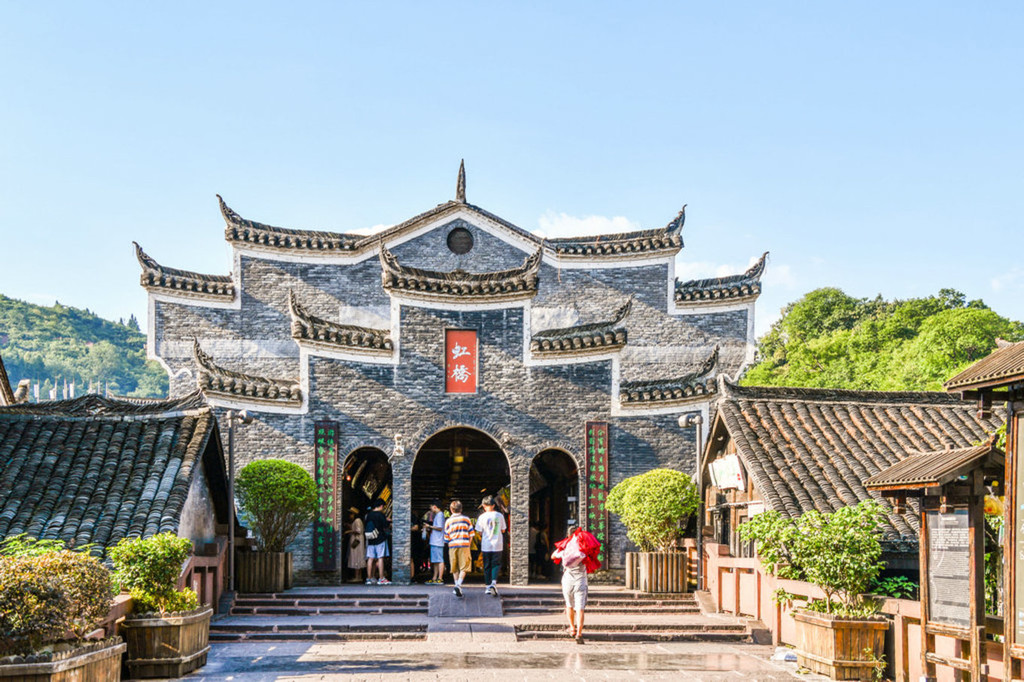 虹桥的两个桥墩成船形,恰似一条雨后彩虹横卧在沱江上,故亦称“卧虹桥”。当年桥上两侧各建有12间悬出桥外的吊脚楼廊房,开设有酒家烟铺和各种商店。