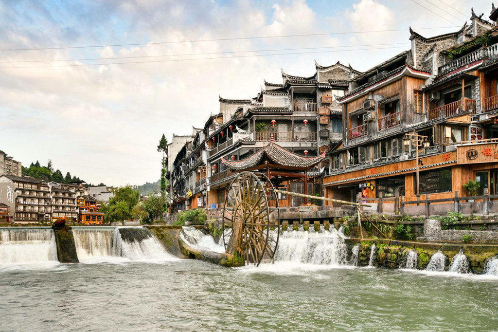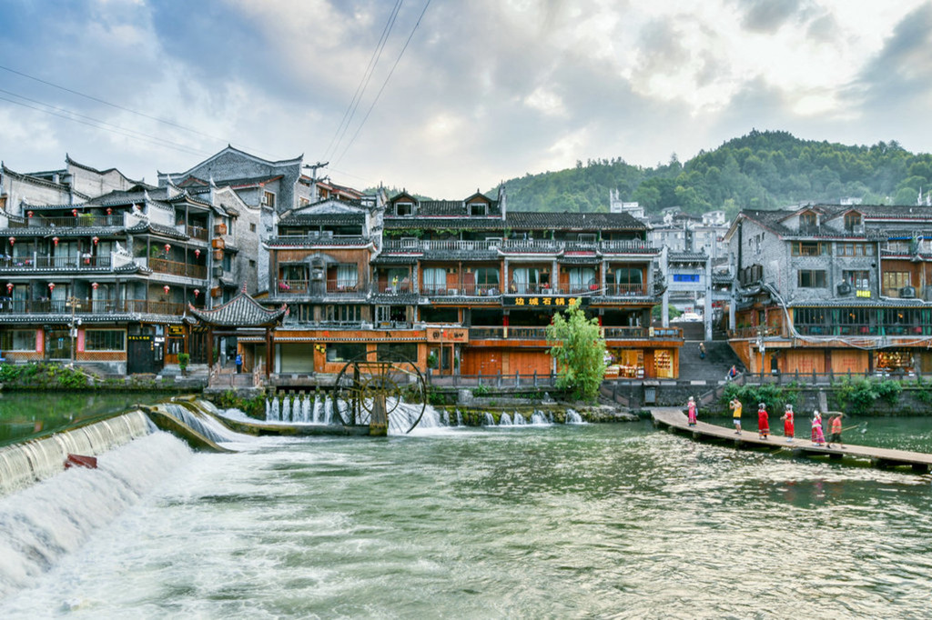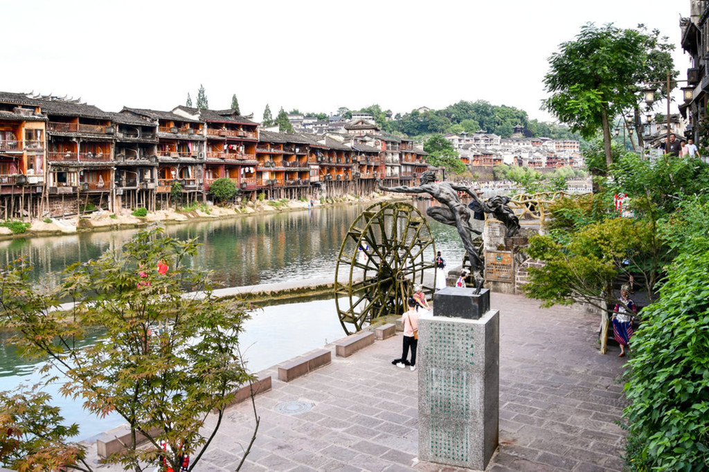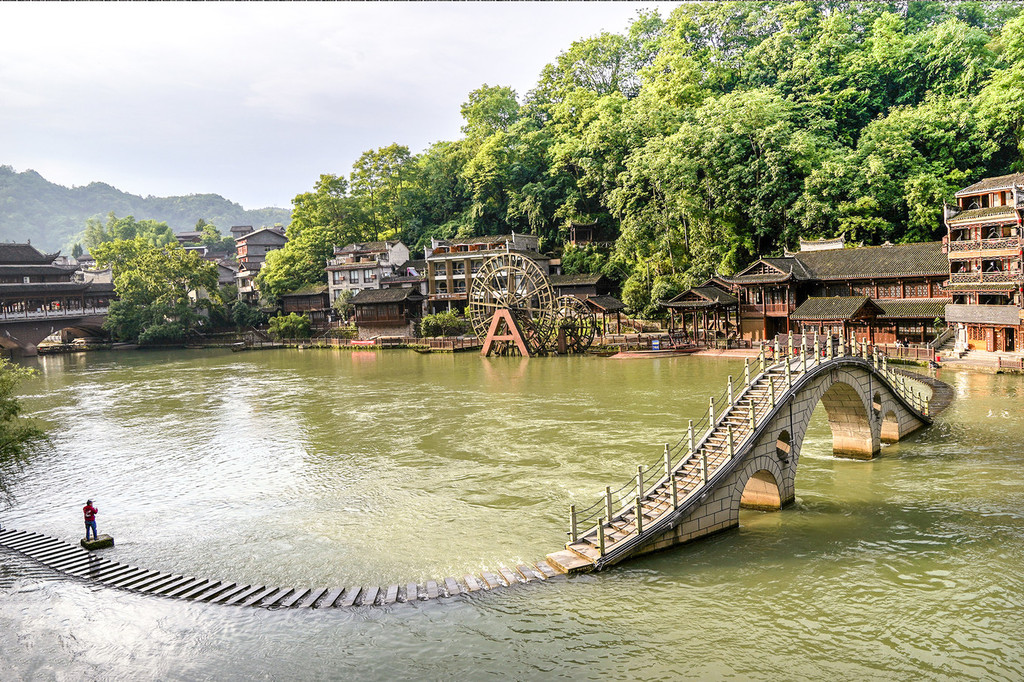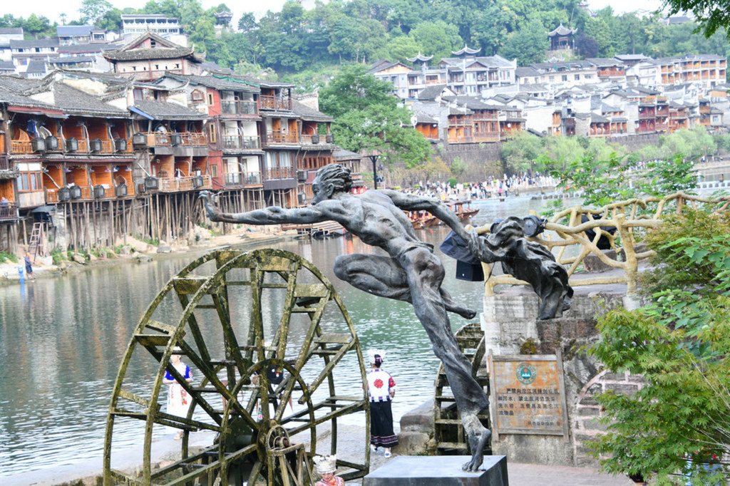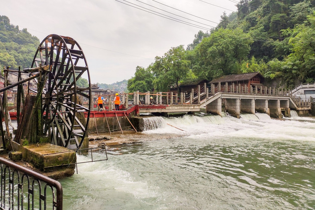 沱江因多日的大雨而水流丰沛,大水轮悠悠地转动着。这正好简炼地标明凤凰淳厚古朴的原始性格。凝望着江水和对岸隐隐可见的白塔,不觉想起了沈从文的妙笔。