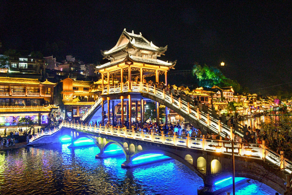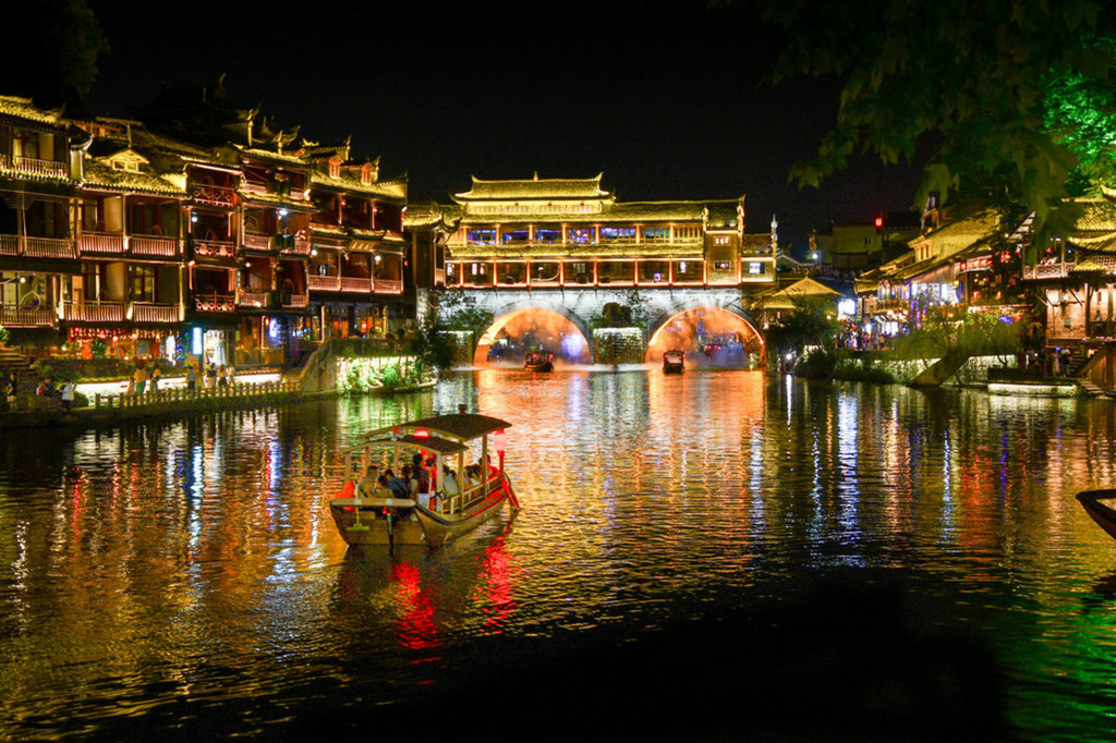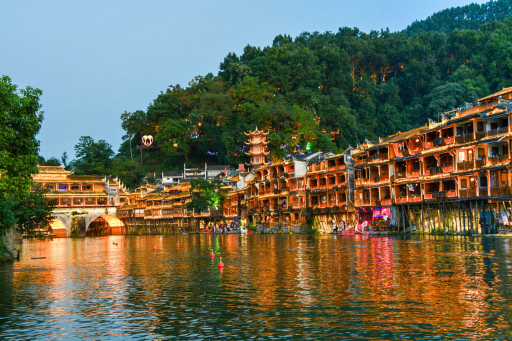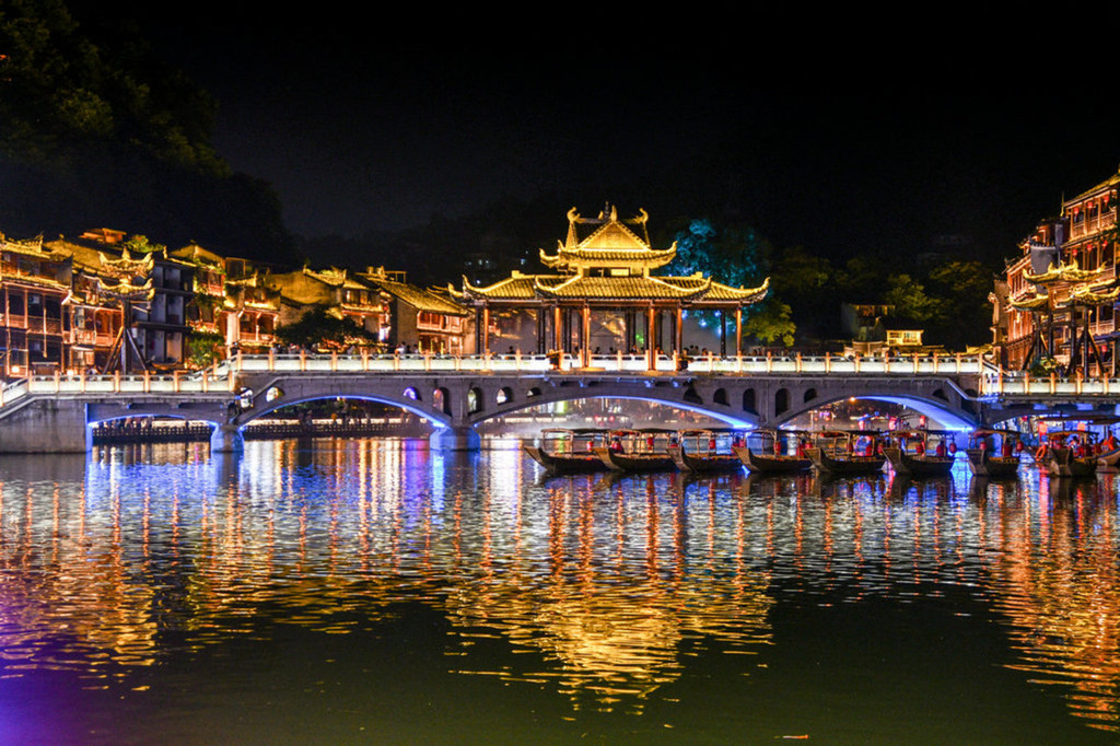 苔痕茵绿的古虹桥和北门简陋的木板、红石跳岩小桥下,清澈的沱江水在月光下闪烁跳荡,铮铮琮琮如一典与自然两相忘的和谐乐章。 凤凰古城 展现出一种无边无际、无我缥渺的空灵。