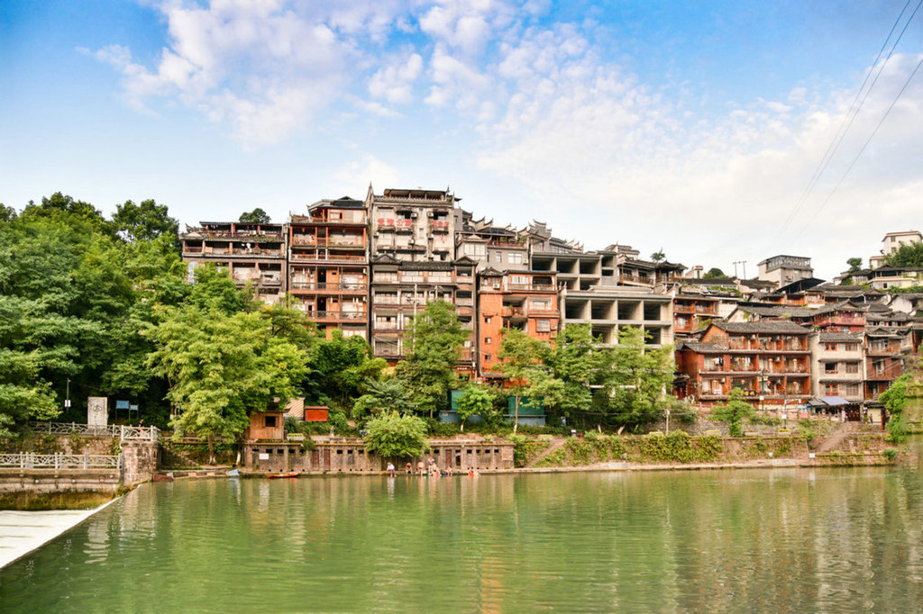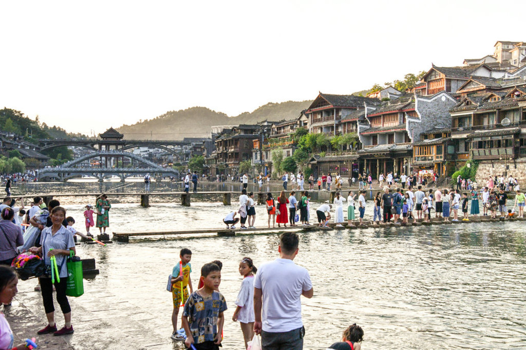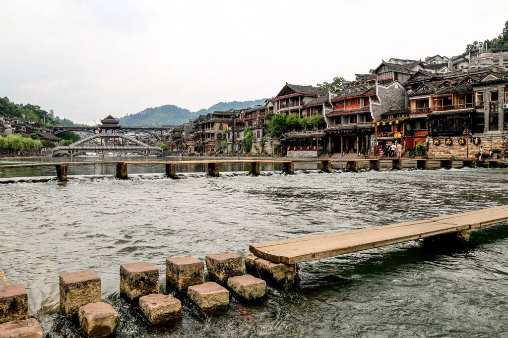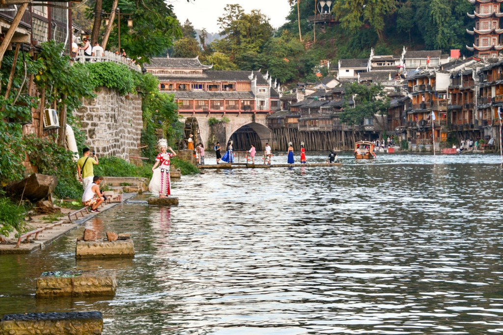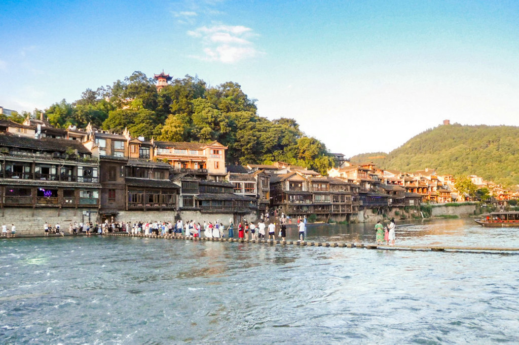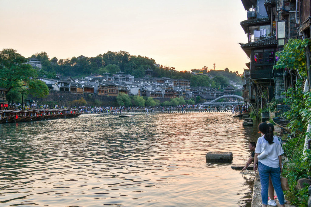 江水滔滔,游人穿梭、并逗留于沱江两岸,站在南岸,瞧对岸与沱江相依而建错落有致的苗族建筑群