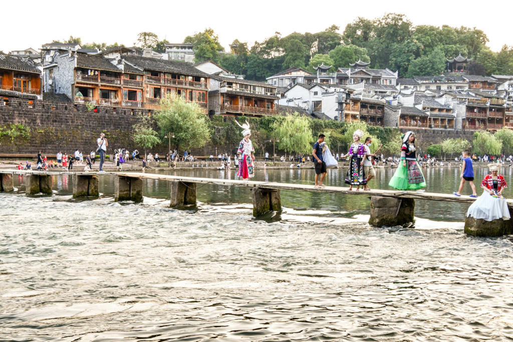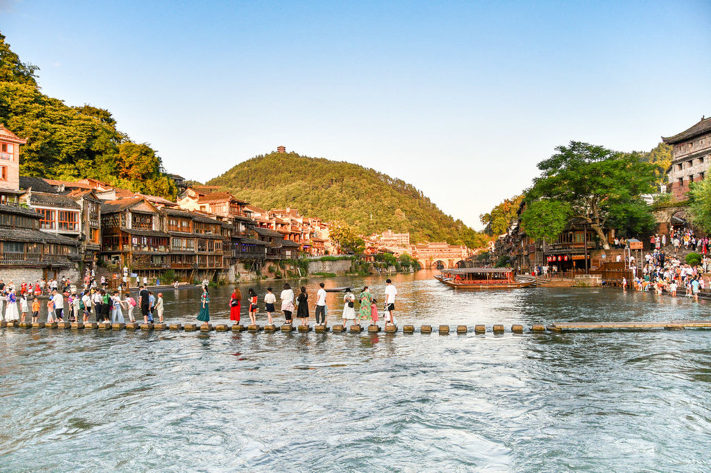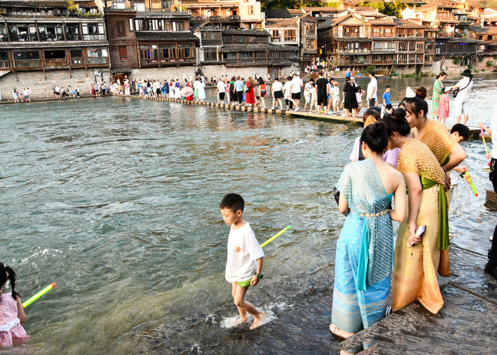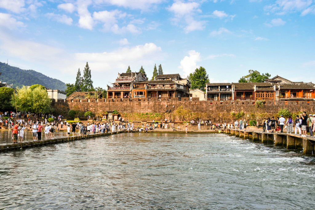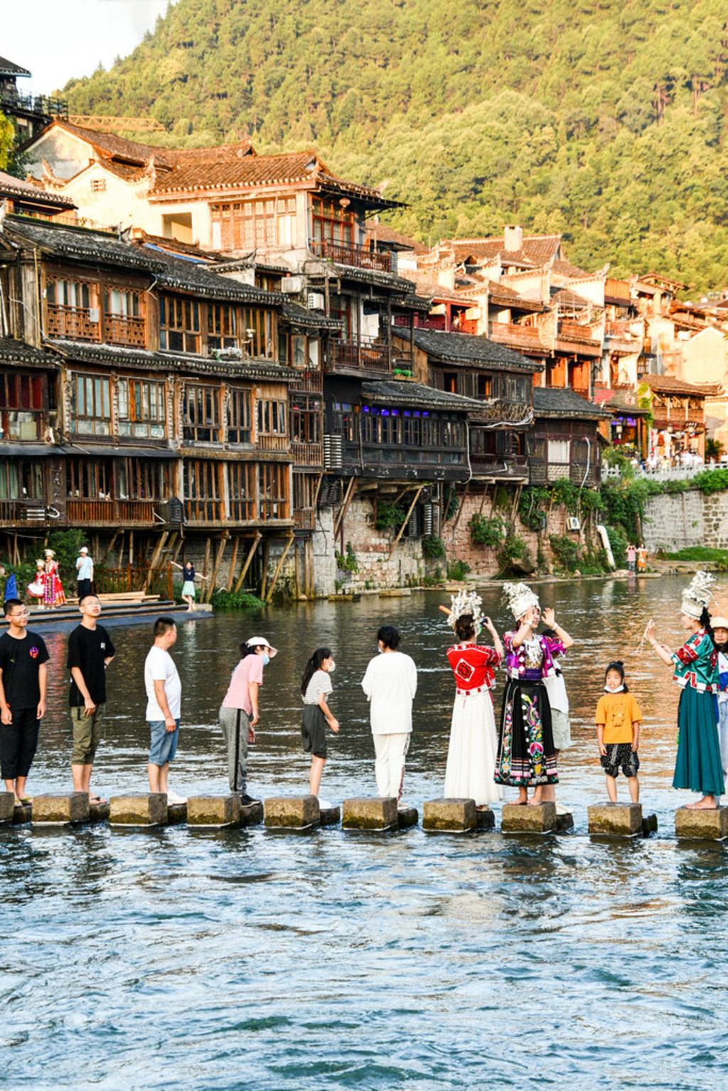 江水滔滔,游人穿梭、并逗留于沱江两岸,站在南岸,瞧对岸与沱江相依而建错落有致的苗族建筑群