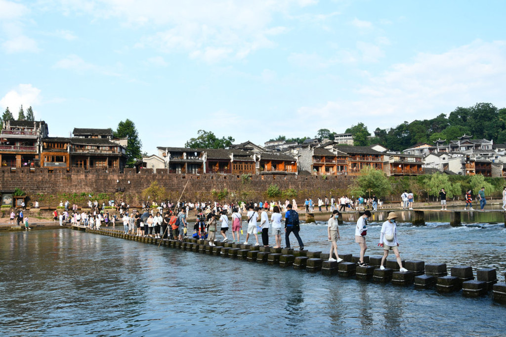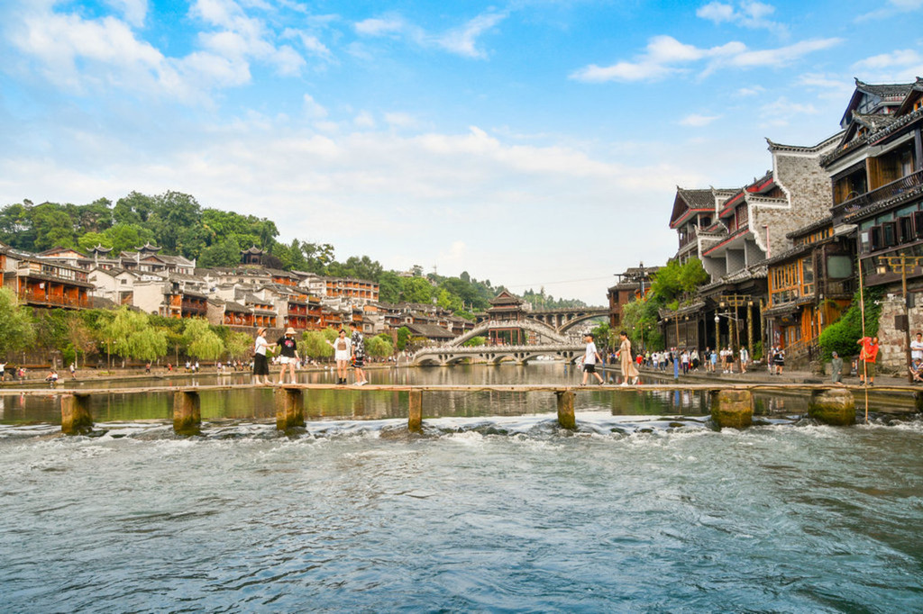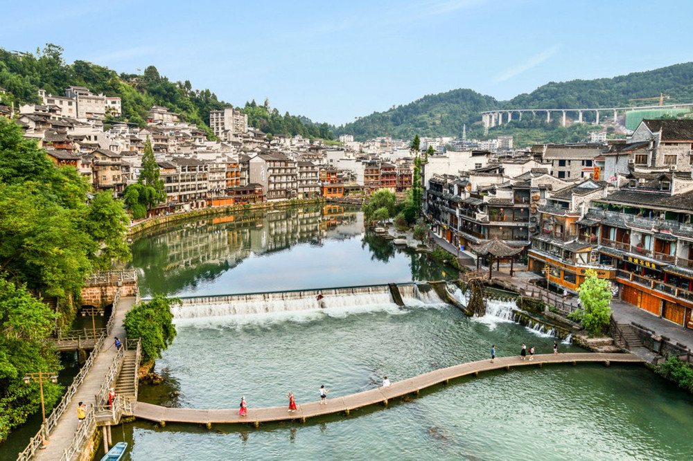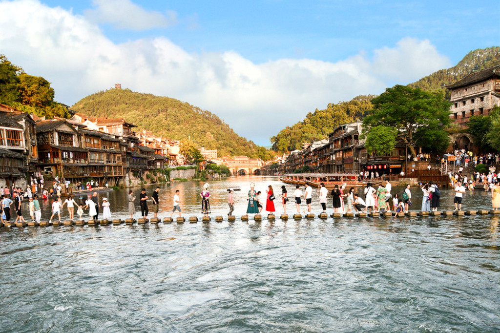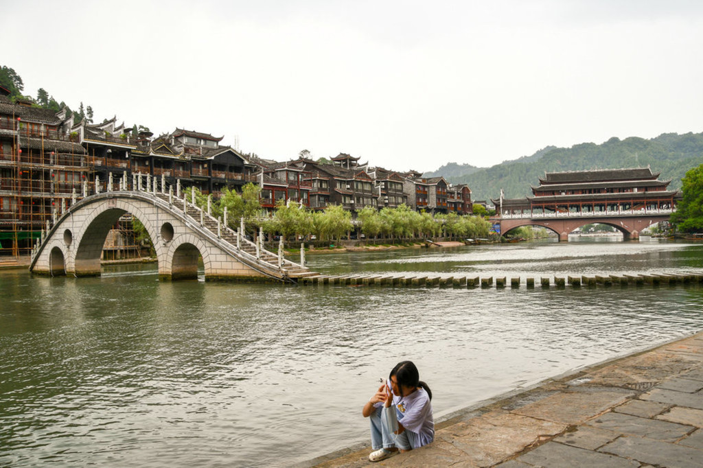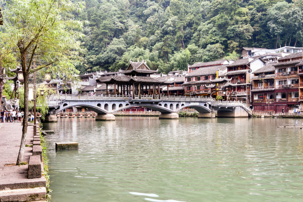 江水滔滔,游人穿梭、并逗留于沱江两岸,站在南岸,瞧对岸与沱江相依而建错落有致的苗族建筑群