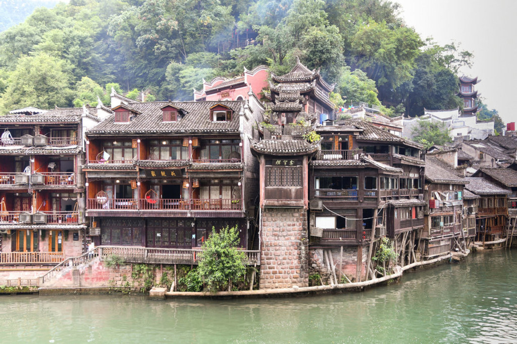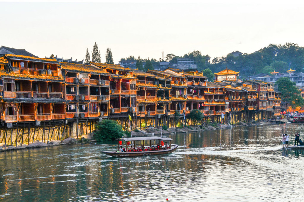 清晨的 凤凰古城 ,薄雾笼罩,第一缕阳光温柔地抚摸着吊脚楼,