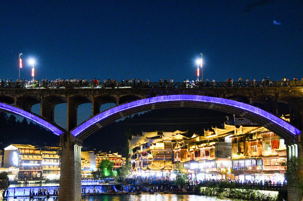 凤凰风光中,桥是一道大手笔。浸透了历史的风雨,与水、与岸,一起构筑着流动中的平衡画面,承载着多少匆匆的脚步,见证了多少人生的旅程。沱江上的桥,就是一首歌,一首难以忘的歌,它是一首诗,一首永远回荡在人们心中的诗,久远,久远……