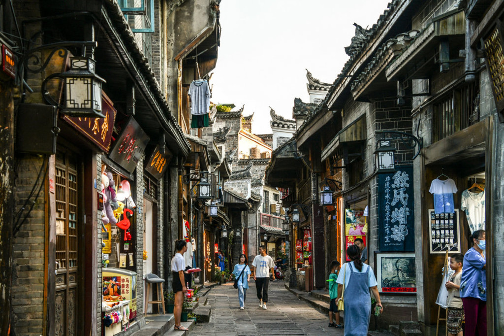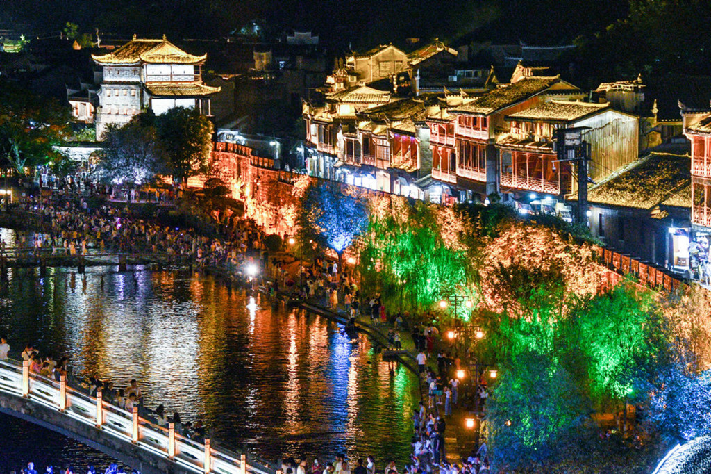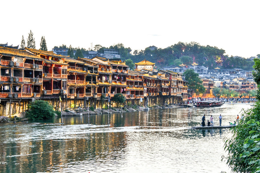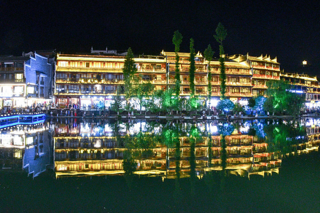 飞檐翘角的吊脚楼倒映在清澈的沱江,恰似一幅华丽的油画。