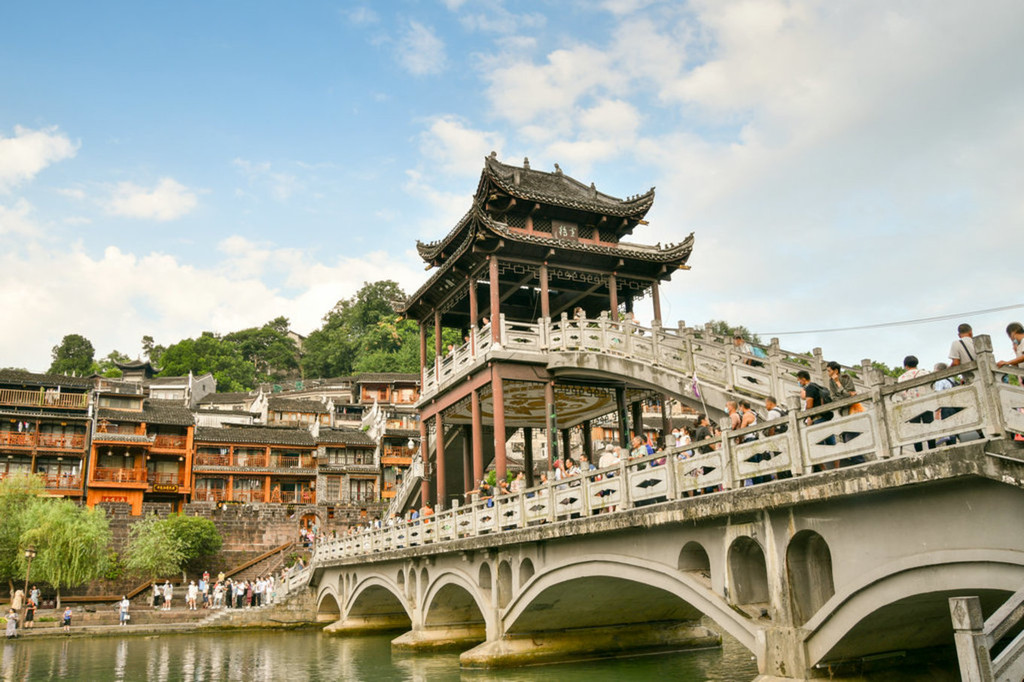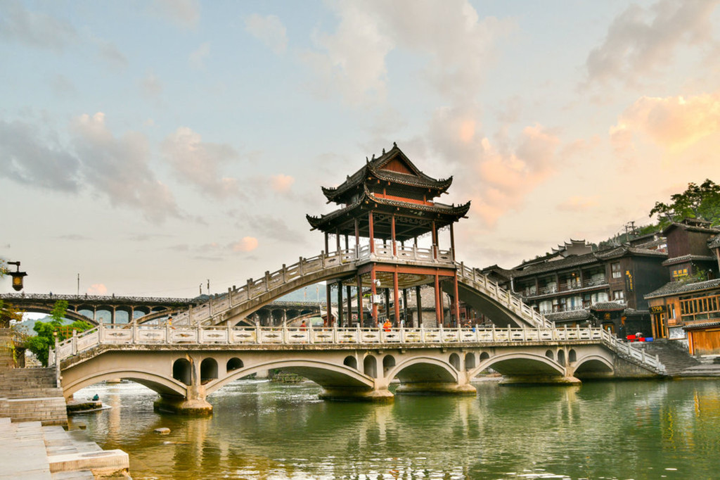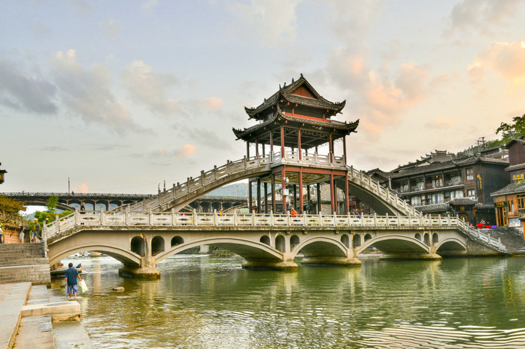 云桥,是 凤凰古城 建成不久横跨沱江两岸的又一座新桥,它看上去显得古朴而宁静、大气又美丽。桥上共有两层仿古建筑,由左右两部分桥体及桥上仿古廊亭组成。为 凤凰古城 又增加了一道靓丽风景。
