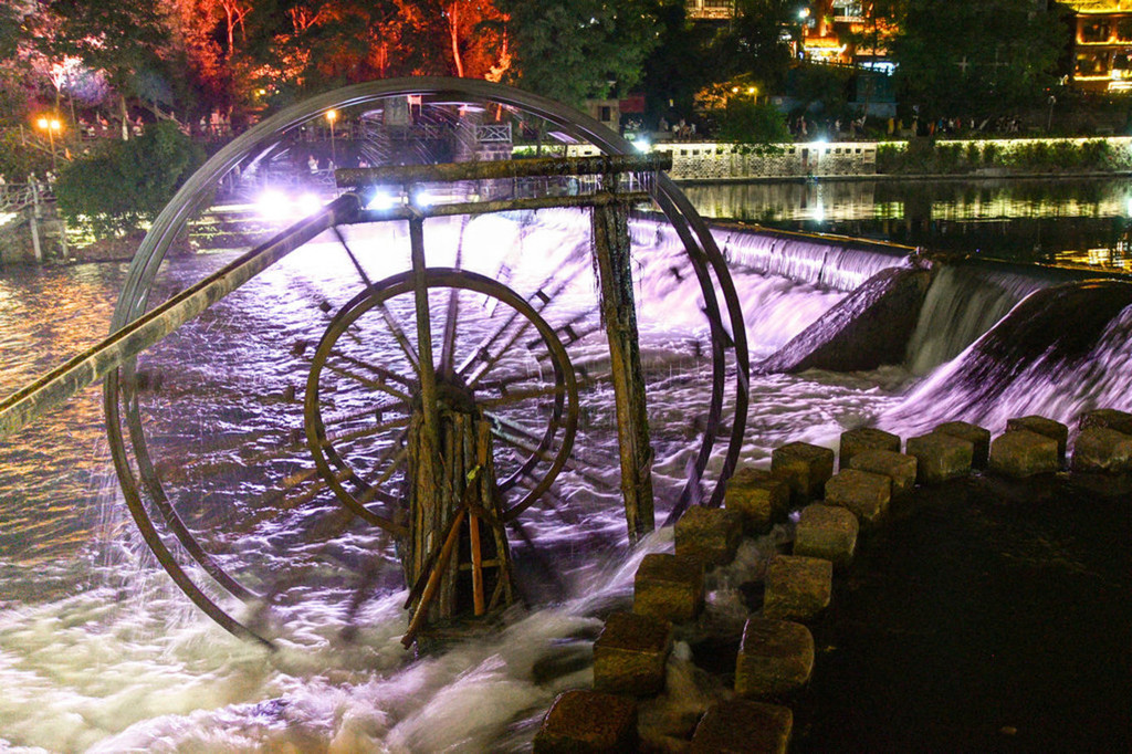 电灯光,月亮光交相辉映,原本平静得像一块碧玉的廻龙潭,这时却变成波光粼粼,色彩斑斓,让人仿佛不是在看古城的夜景,而是置身在 九寨沟 的五彩池边。