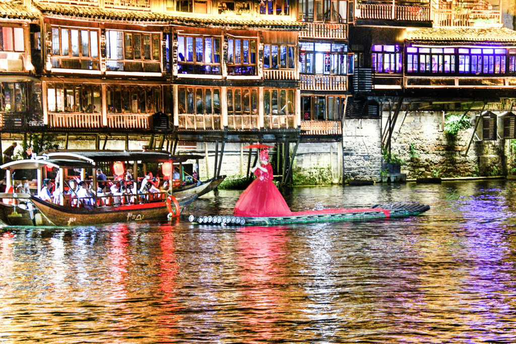 夜晚的 凤凰古城 更是别有一番风味。火红的光芒染红整条小河,那景色真让人陶醉不已。