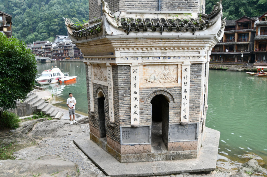 我为这尊铜像的巨大张力感到震撼。近到碑前,看到立于水中的石碑上面,密密麻麻的文字记述的是《王湘冀传略》。1982年6月21日,凤凰县煤炭公司年仅18岁的职工王湘翼,从沱江激流中奋力救出了3名溺水儿童,却献出了自己年轻的生命。为了弘扬王湘翼舍己救人的精神,凤凰藉当代著名画家黄永玉倾情设计了王湘翼烈士铜像,将其矗立在王湘冀牺牲的沱江岸边。