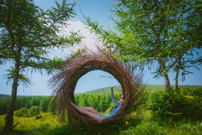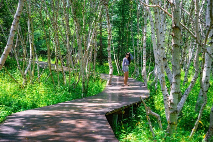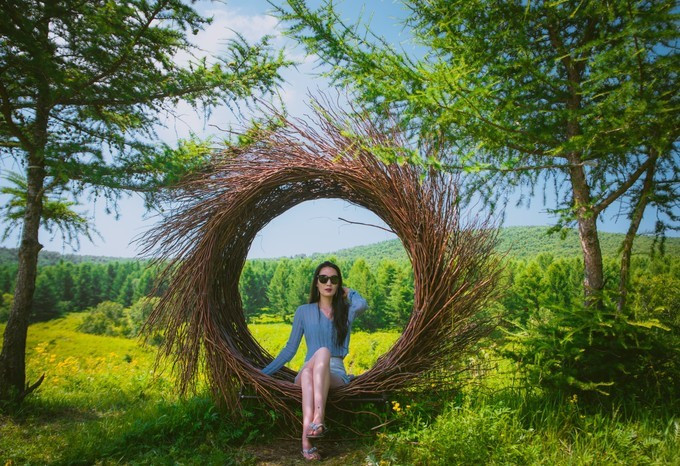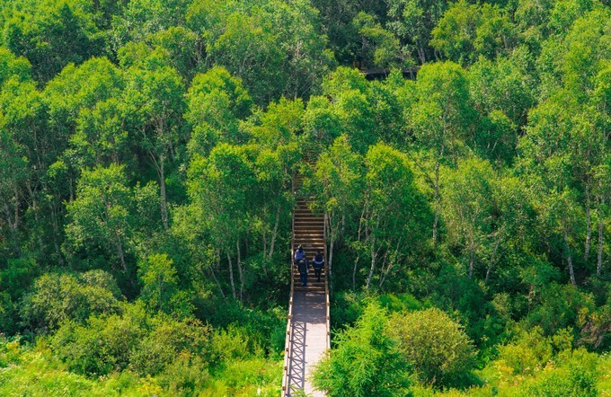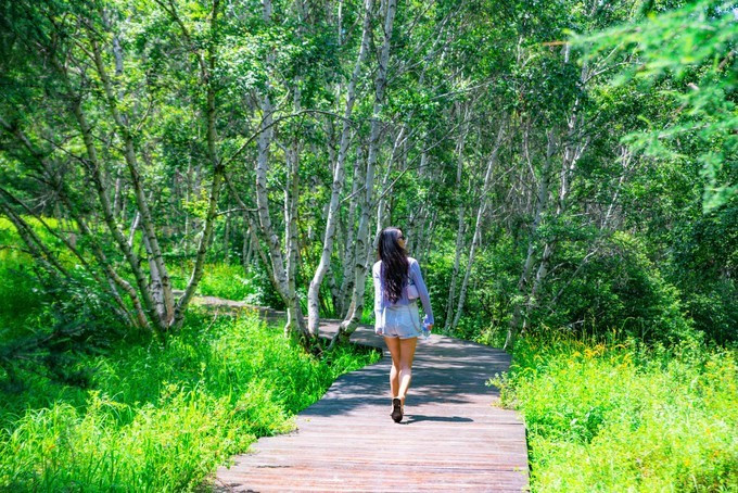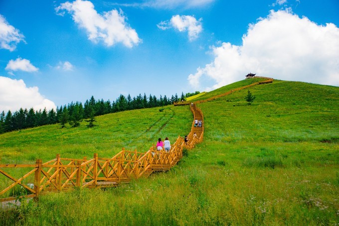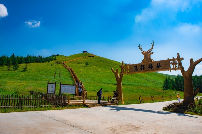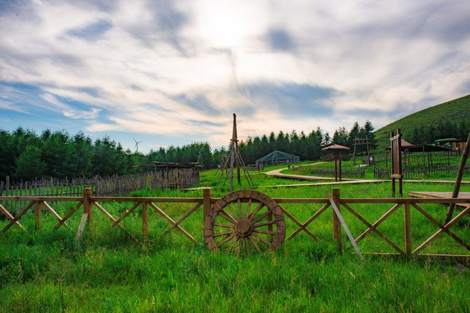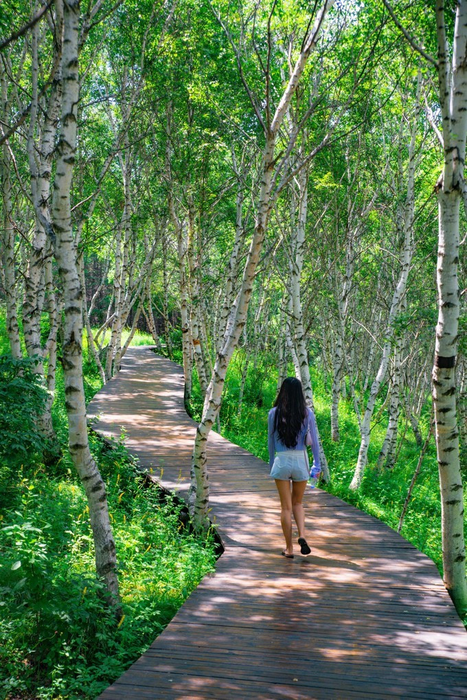 这一段木栈道被茂盛的白桦林所覆盖,它有一个很美的名字叫做——白桦映日。木栈道贯穿其中,一路光影斑驳,中途有不少的休息亭和观景台,可以在这里稍作休息,耀眼的阳光透过随风摇曳的白桦树,弱化了它的热烈,温暖的打在脸上,加 上林 间穿梭的微风,仿佛梦境。天镜湖是一个人工打造的小型观景湖。它地势低洼且平坦,四面环绕着茂密的森林,湖面异常的平静,像一面镜子一样,名字由此而来。蓝天、白云、绿树、掉落的黄叶,都把最美的色彩映射其中,让人难以分辨哪个是倒影,哪个是自然。玛瑙湖与天镜湖一坝之隔,景色更甚,湖面晶莹剔透像一块天然的玛瑙一般,平卧在美丽的草原深处。如何才能与玛瑙胡有一张完美的合影呢?网红水床自然不能错过~从高处俯瞰,天镜湖与玛瑙湖就像一对孪生兄弟,一个胖一个瘦,中间连在一起,永不分离。或者更像是神仙遗落凡间的宝玉,色彩美轮美奂,被大自然包裹,一条彩带系腰间。茂密的松林里有数不清的小蘑菇,走在栈道上你会发现有不少的游客都在地上发觉“宝藏”,可爱的小蘑菇是可以食用的,像雨后春笋一般密密麻麻的窜出地面,一丛丛一簇簇,不一会儿的功夫就能采摘许多。【满族文化园】