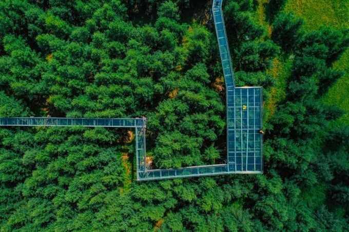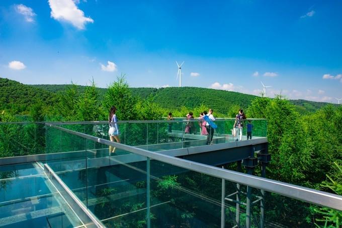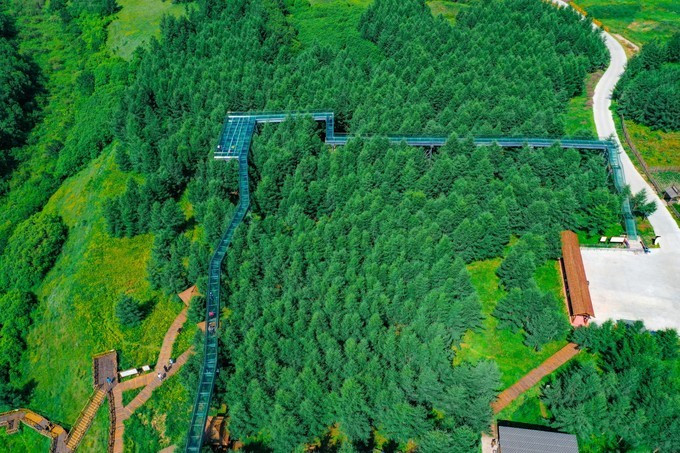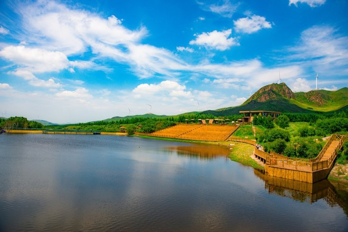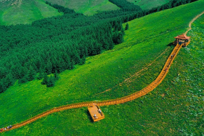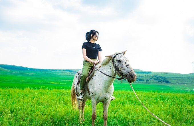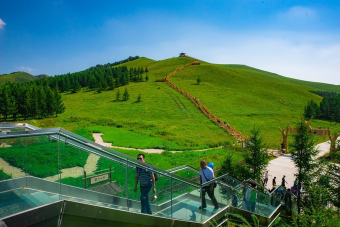 大厅内人流攒动,听口音应该都是来自京津冀的游客。大厅中央摆放着许多当地的特产,例如锅茶、牛板筋、牛肉干、奶条和黑苦荞等等,这些东西现在购买有不少的福利优惠,现在正好对这些企业实行精准扶贫的政策,购买这些产品,比以前优惠不说,达到一定的金额可以享受免费游玩七彩森林的活动,非常的超值。而且这些商品大多数在外面都买不到,送亲戚送朋友是特别好的礼物。穿过售票口到达游览区需要乘坐观光小火车,返程的时候就看自己的心情了,可以一边玩一边走出来,走累了,随时可以在路上拦住返程的小火车搭乘。建议做到最后一站,然后边玩边往回走。丛林部落是小火车的终点站,左侧有一条直上云端的木栈道,顶部的“云亭”海拔最高点约1800米,共有516级台阶。爬上去不是很累,山顶的风光确实绝美。一望无际的丘陵草原、葱葱的万亩森林,远处的天镜湖依稀可见,大有一览众山小的视觉快感。云亭栈道的对面是一段刺激的玻璃空中走廊,有一个有趣的名字——“树梢上的脚步”。有趣的名字,有趣的设计,比起那些建立在悬崖边上的玻璃走廊相比,同样有恐怖刺激的感觉,周围和脚下窜出的树梢,增加了趣味和想象,有种武侠片的感觉,轻功梯云纵,树尖随便飘~旁边的卫生间设计的格外显眼,七彩斑斓的墙砖,外形看起来像是一个倒立的房子。来到草原上必须要体验一次的项目就是骑马,坝上的马虽然不是特别的有名,骑上去有人带着也还算温顺,有的马儿胆子特别小,你如果从它身边路过,它都会紧张的绕开你走;还有的马儿3匹一组2匹一对,亲近的走在一起,不熟的相互排斥,特别的有意思。走到尽头是一片天然的花海密林,里面有适合打卡拍照的网红鸟巢,在草原上拍摄鸟巢的打卡照片还是非常应景的,周围就有悦耳的鸟叫声回荡。【旖旎天镜湖】