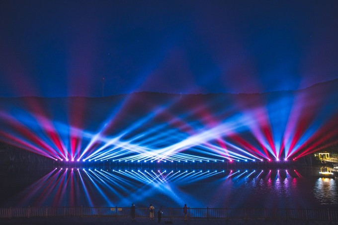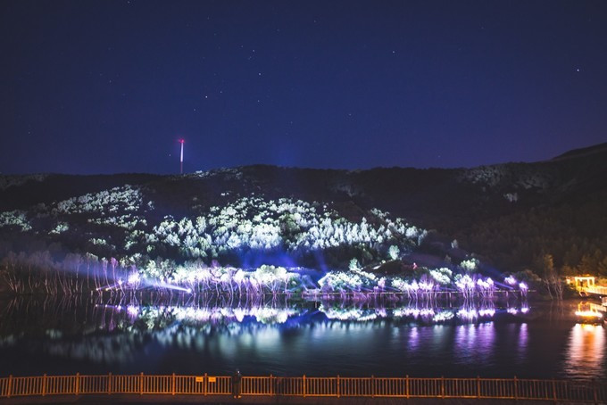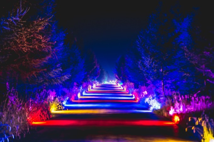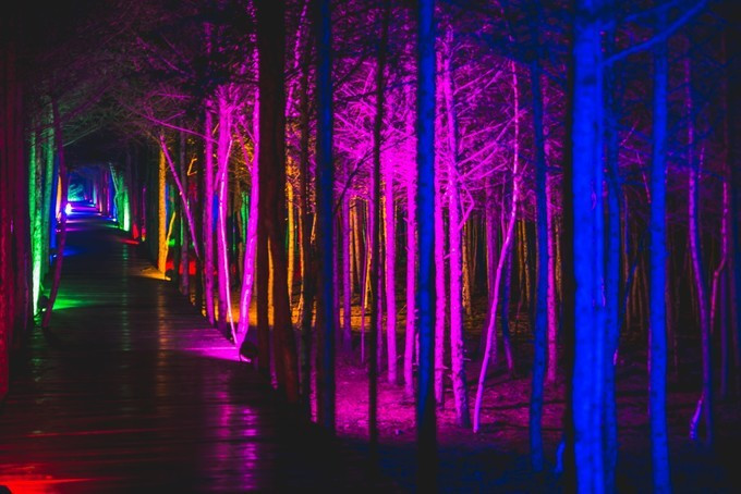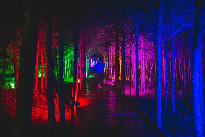旅行的美好时光不能浪费,晚上的七彩森林依旧热闹非凡。全长约2000米的森林之夜游览区,是七彩森林景区的夜间游览项目,游览路线从景区入口到天镜湖。漫步在丛林木栈道中犹如置身丛林秘境,光与影的结合让森林之夜拥有了梦幻的色彩。