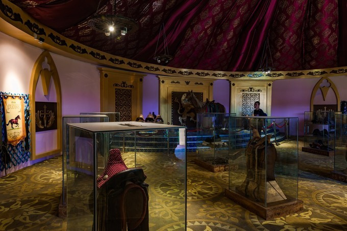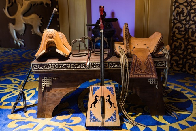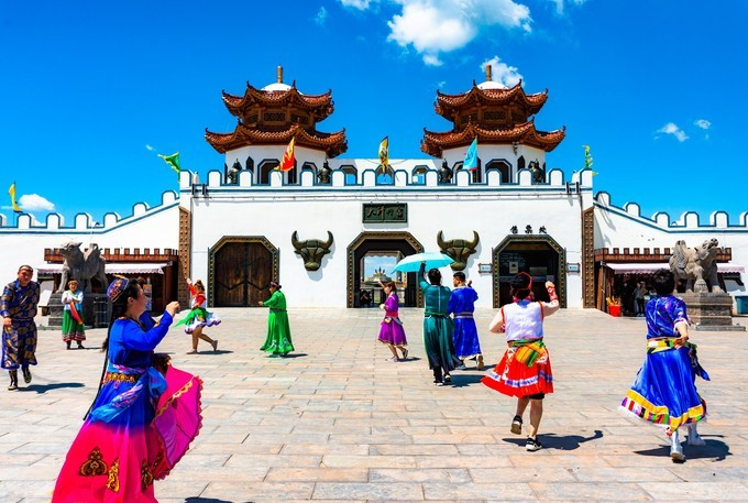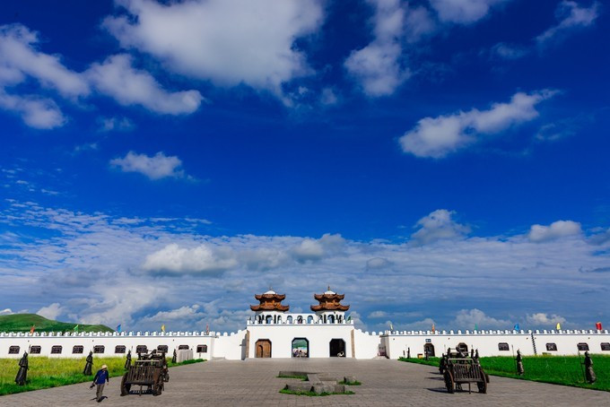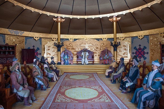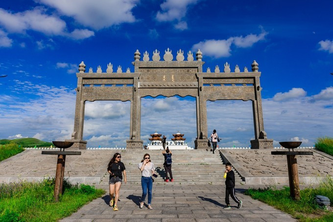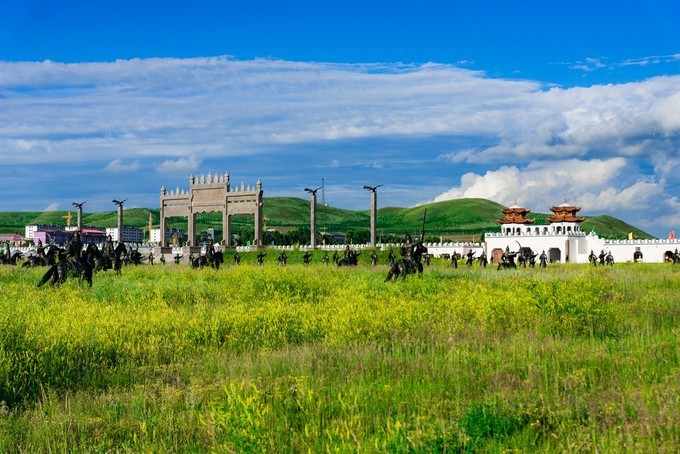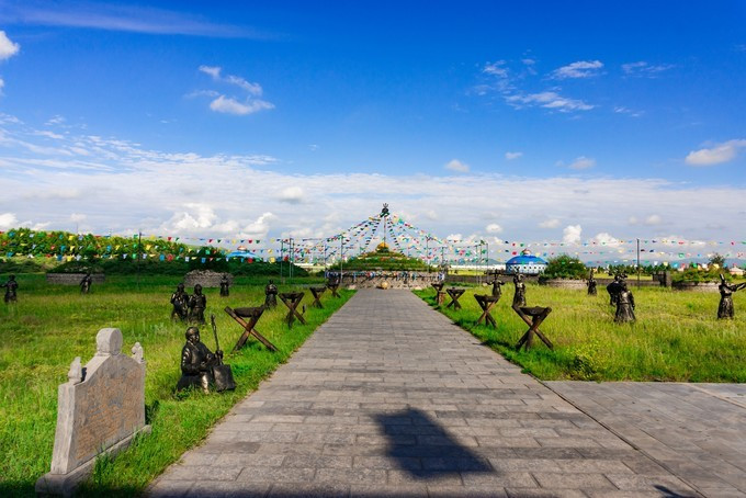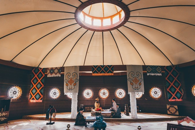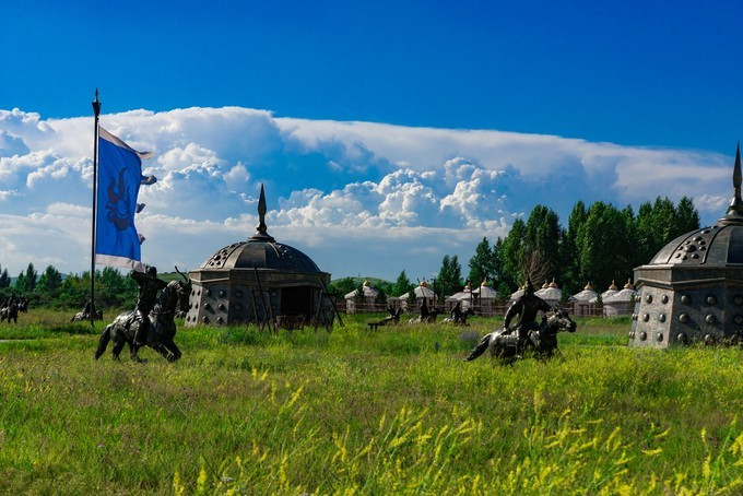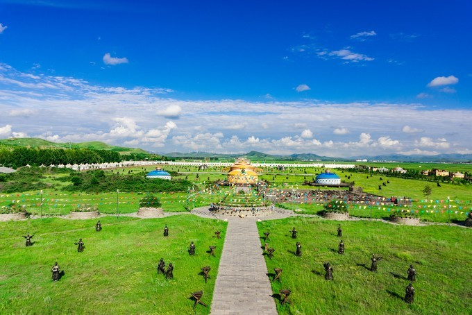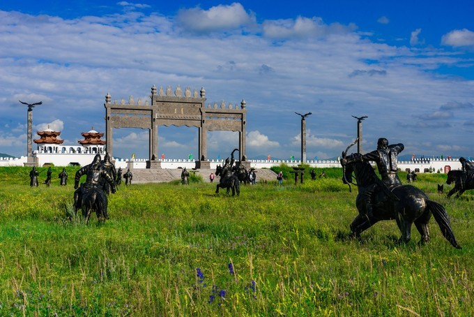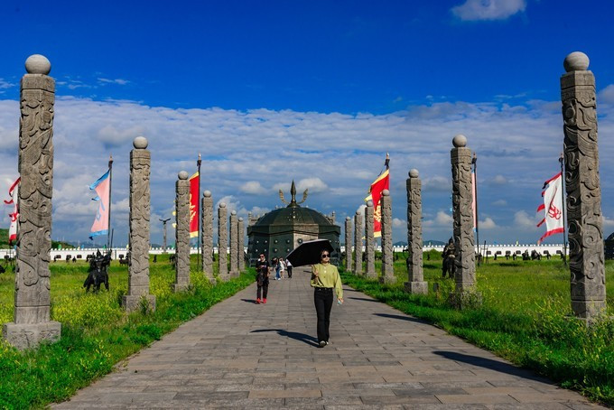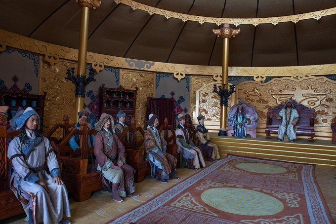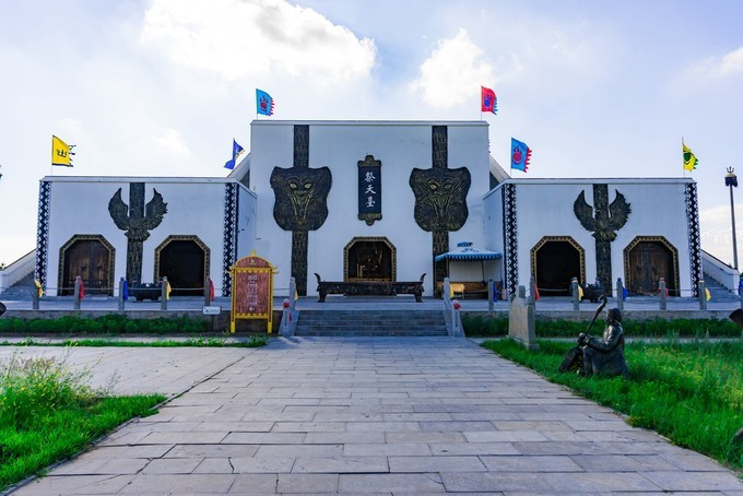 雄壮威武的大汗行宫宫殿区,里面有一代天骄 蒙古 族英雄成吉思汗和他子孙们的传奇人生故事。整个宫殿区由宫门、崇 天门 、成吉思汗的军帐、议事金帐、寝帐、敖包和祭 天台 组成,是典型的宫廷式中轴线建筑,后面还有成吉思汗四个儿子建立的四大汗国游览区域。