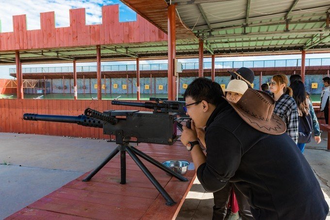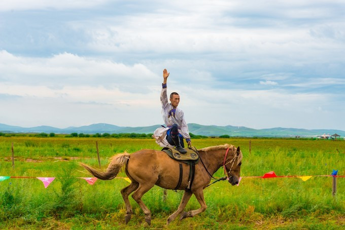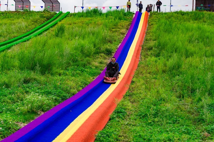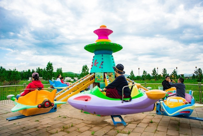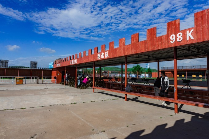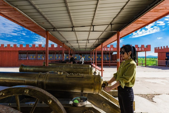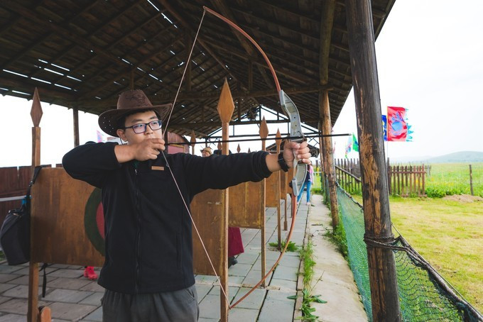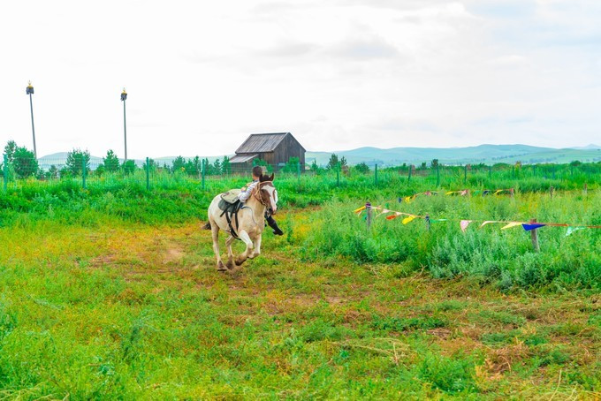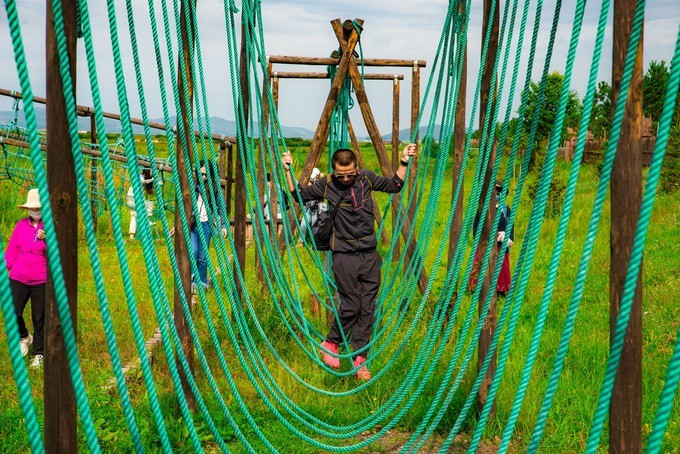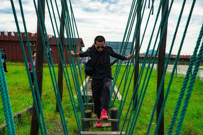 自控飞机、旋转木马、趣味碰碰车,人多才好玩,带上孩子家人都参与进来,快乐一定会翻倍,这种的游乐设运作几分钟,是小朋友们最喜欢的项目之一,有的家庭没有玩尽兴,还会在来第二次。虽然说这种儿童类娱乐设施很常见,但是在草原上玩,感觉还是不一样。游乐场的旁边有一片美丽的格桑花海,红白相间,风车、凉亭美美的挺立在中间,一幅唯美的乡村田野的画面。租一件景区里的特色民族服装,在这里打卡拍照是一个不错的选择。马术表演一天有四场,一定要提前看好时间来到赛马场,其实就在高尔夫球场的旁边,我们是打着球看节目开始了就顺便过去,一点也没耽误时间。节目很精彩,身穿蒙袍的小伙子们,在马背上闪转腾挪,无比娴熟的马技让人叹为观止,特别羡慕他们这种马背上的汉子,飒爽英姿。拓展项目里面是成套的,连续的好几种玩法,差不多都需要手脚并用才能完成,要想通过没有失误,一定要有良好的身体素质,几个人来一场竞技竞速赛,也是很有意思。彩虹滑草在金莲湖旁边,没有体验之前心里还在嘀咕,会不会一下从山坡上直接冲到湖里。其实这个还是挺安全的,滑道并不长,先快后慢,刺激又稳健。玩完彩虹滑草后面紧接着就是环湖一圈的卡丁车,一车可以做两个人,无级变速但是最高也就只有40迈的速度,很安全。路面是那种不是很平坦的土路,一路飙车尘土飞扬,超级欢乐。要说最喜欢最好玩的是哪个项目,我觉的必须是草原漂流,两人一船,随波逐流就行,完全不用划桨,河道并不宽,想要超船可并不用容易,全程大约需要25分钟的时间漂玩,全程欢声笑语不断,是公认的最好玩的项目。玩累了 蒙古 包里喝喝奶茶休息一会,骑马马上安排。上午看了马术表演,早就跃跃欲试,想要体验一下骑马的感觉。坝上的马还算温顺,不过没有骑马经验还是要有人带着才行。骑上以后发现,这果然不是一个简单的活,索性就让马夫牵着走,骑马变成了遛马,不过能这样骑一次马,打开拍照也可以炫耀朋友圈了。骑马射箭向来都是连起来说,骑马过后在射箭练练手,靶场就在马场旁边,话说我这个技术呀,十射九不中,贻笑 大方 了。弓箭玩不了,现代冷兵器还是很有兴趣的,湿地入口就有一个射击靶场,里面有好几种靶位,子弹大小也不一样,从2米长的巨炮到小时候经常玩的弹弓,应有尽有,有喜欢射击的可以在这里玩上个把小时。当彩虹遇见晚霞