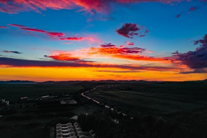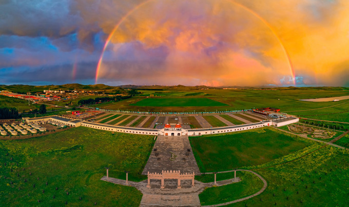 如图所见,两条彩虹挂在天边,话说印象里这是第一次看见彩虹,超兴奋超激动,雨刚停还没有完全放晴,彩虹上面还是乌云密布,不过能看到双彩虹,也算是这次旅行一个不小的收获。光有彩虹还不能体现草原的惊艳,一边是阴雨下的唯美彩虹,另一边却是艳丽的落日晚霞,同一时间,同一地点,两种不同的美景同时呈现,置身当时的场景,如梦似幻。大汗行宫狂欢夜