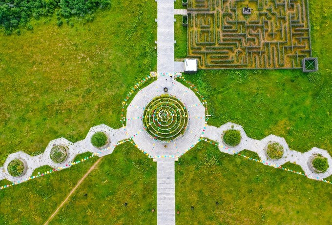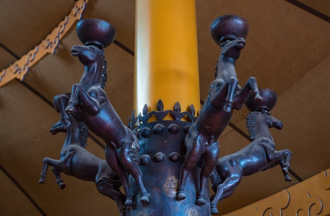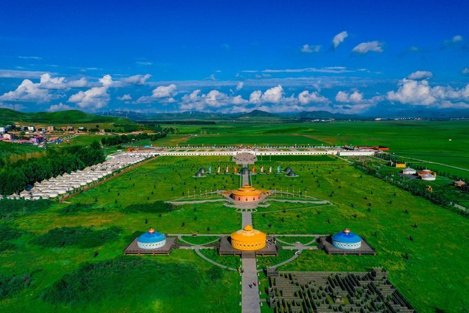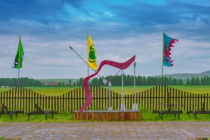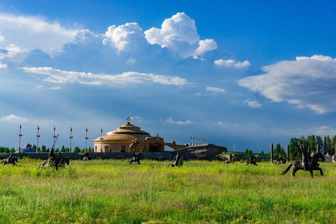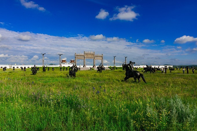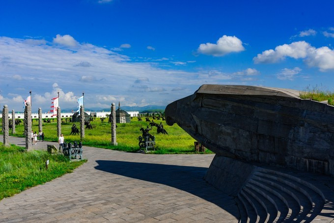 穿过检票口也就是宫门,就已经正式进入大汗行宫景区的宫殿区,广场中间有一块长达16米的巨型长方条石竖卧在行宫中轴线上,那是一个蒙文的——汗字,保留着 蒙古 民族英雄成吉思汗的伟大灵魂,一个马背上民族漫长而辉煌的历史。第二道门是崇 天门 也称叫做长生天牌坊,牌坊是古代人用于表示忠孝节义的纪念物,后传入宫中这是元代帝王才配享用的石牌坊。穿过牌坊被眼前的景象所惊呆,数不清的士兵雕像矗立在军帐之前,仿佛回到了那个金戈铁马行军打仗的时代,士兵们各个表情威严,列阵以待,重现当年蒙元铁骑的神威。后面是成吉思汗点兵的军帐,每个军帐都是由20吨的铁打造而成外形犹如古代的战盔,寓意这坚不可摧,正中心的为成吉思汗的中军大帐,周围的四个军帐为成吉思汗四个儿子的军账。军帐后面的路是帝王道,道路两侧分别有9根盘龙柱一共18根代表的是皇室的身份与地位。帝王道直通一座金色的大帐,这是成吉思汗的议事金帐又称鹰帐,据导游说,他是世界上最大,最具有特色的成吉思汗议事金帐,鹰是 蒙古 民族的信仰,整座金帐座建在鹰背之上,苍劲有力,雄壮威武。金帐里面的场景就是成吉思汗于众臣商议国家大事的场景,坐在中间的就是一代天骄——成吉思汗,左右两边的分别为正妻孛儿帖和侧妃忽兰,左右两边分别是 文武大臣,导游讲述了许多关于成吉思汗的历史故事,不过脑袋里记下的不多。后面的就是寝帐了,蒙元不同于任何封建的王朝,在外出打仗时还带着自己的后妃,其实 蒙古 族是草原部落,他们都是游牧民族,随着草地的富足而行,所以成吉思汗外出打仗是带着他的后妃的,而且军队所需的物资都是带着一起同行的 。所以在每个寝帐下边都按有车轮的,就是为了方便行走,这个带着车轮的帐有个学名“嘞嘞车”据说当时成吉思汗的寝帐是有64匹战马拉动的 可见其雄伟壮阔。在往前面就是敖包了,中间大的就是代表长生天,其余的俩边分别有6个为他的十二户足。敖包之后是现存世上唯一一座集萨满教、佛教、道教一体的祭 天台 。据说在 蒙古 时期人们信仰崇拜的是长生天,也就是人们常说的萨满巫师,左右俩边分别能看见的就是当时祭奠长生天的场景,有萨满巫师、乐师、宰杀牲畜以及诵咏的场景。中间的是佛教堂。旁边有楼梯可以走到祭 天台 的楼顶,俯瞰整个宫殿区,非常的壮观。祭 天台 是整个宫殿区的最尾部,面向祭 天台 的左右边有 通道 ,宫殿区一侧是四汗国历史游览区。历史记载公元1219年成吉思汗率大军西征,以战争手段严惩杀害 蒙古 使者和商队的 中亚 大帝国华刺子模国,此次西征远抵里海与黑海以北、 伊朗 、 阿富汗 、 印度 等地,对世界历史发展产生了深远的影响,1225年成吉思汗凯旋东归,将本土及所征服的西域土地分封给了四个儿子,后来发展为四大汗国。海流图湿地公园