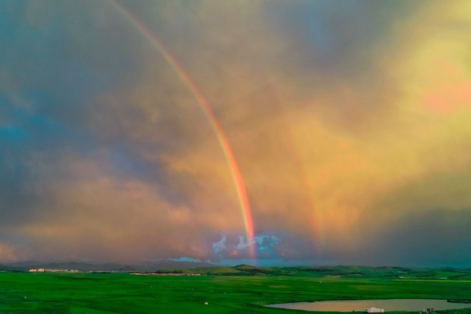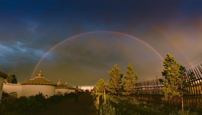 今天的草原上的天气可真是让我大开眼界,甚至可以说是幸运。玩了一天回 蒙古 包里休息,完事准备吃完饭,就这一会的功夫,刚才还是晴空万里,不一会儿的功夫听到了打雷的声音,紧接着就是瓢泼大雨,大概下了有半个多小时,雨停了之后就听见外面喊:有彩虹、有彩虹。瞬间我就从床上蹦了起来,拿上相机飞奔出去。