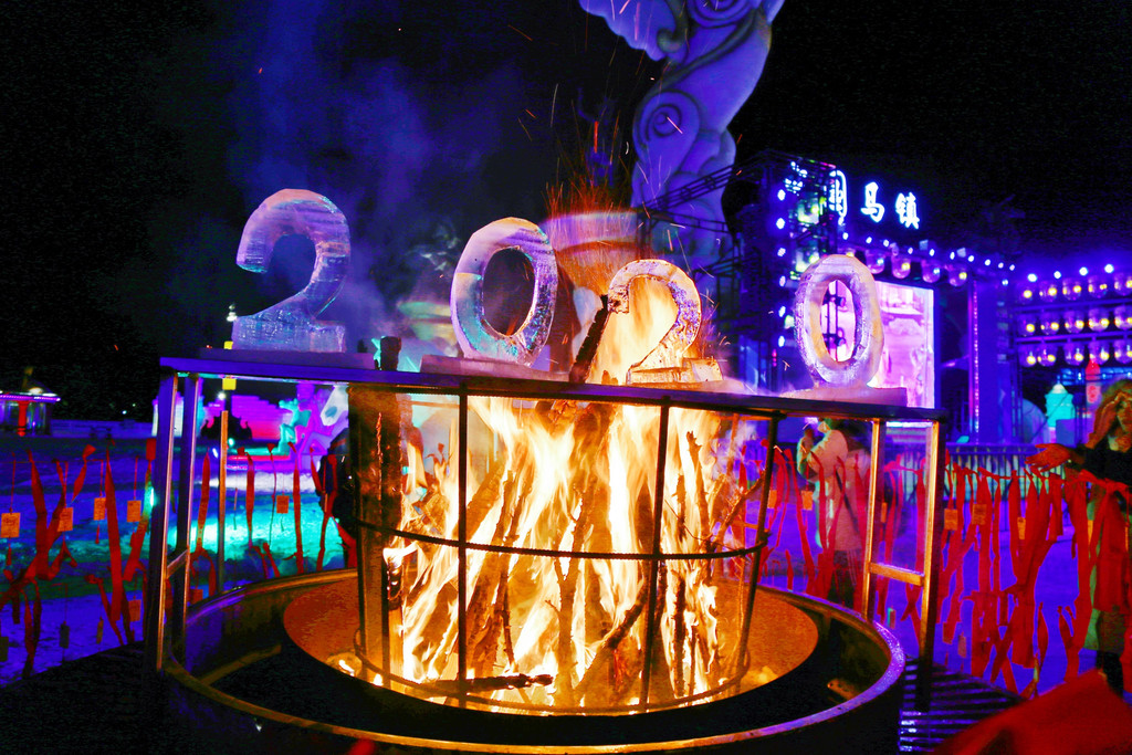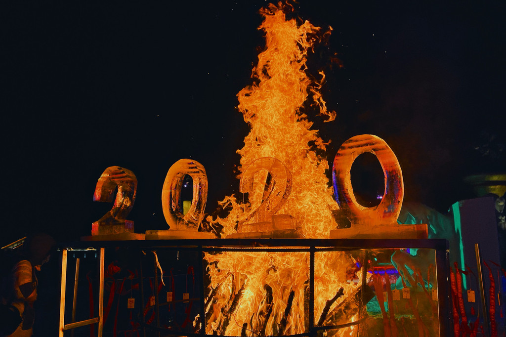 演员手举火把点燃篝火,其中一侧篝火上放着2020的冰雕,在熊熊火焰中慢慢融化。