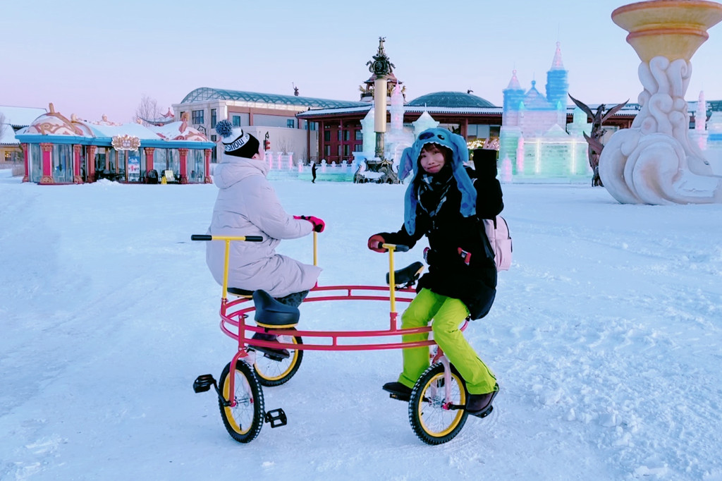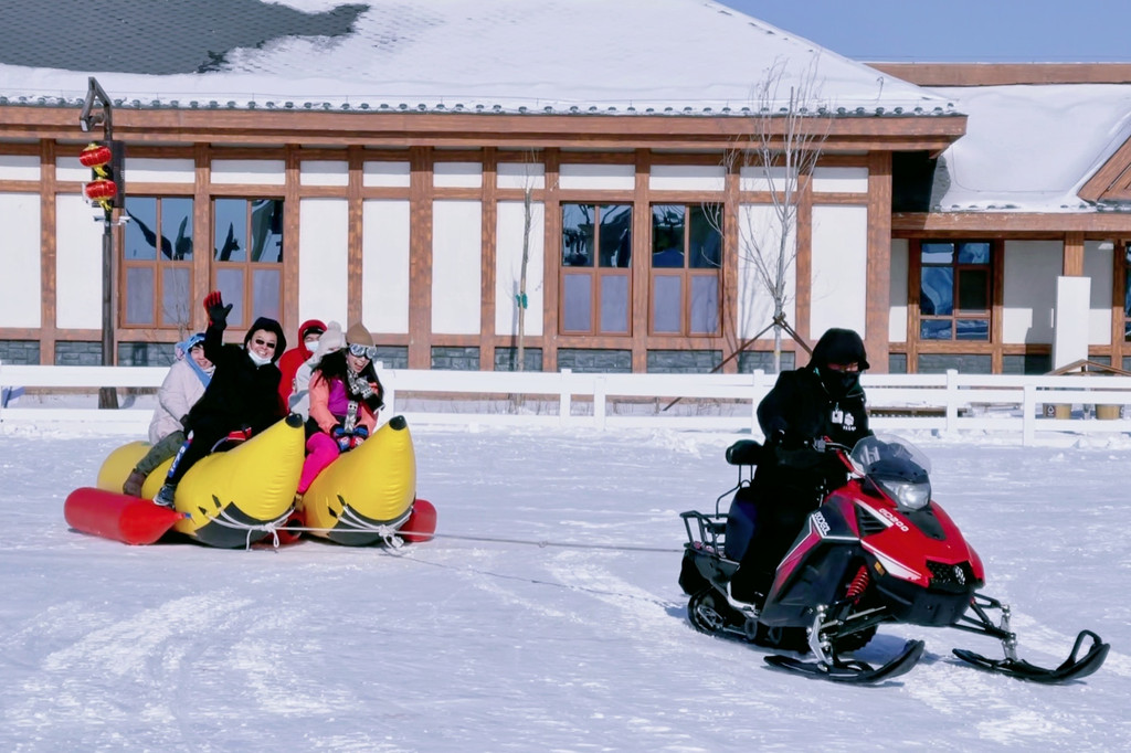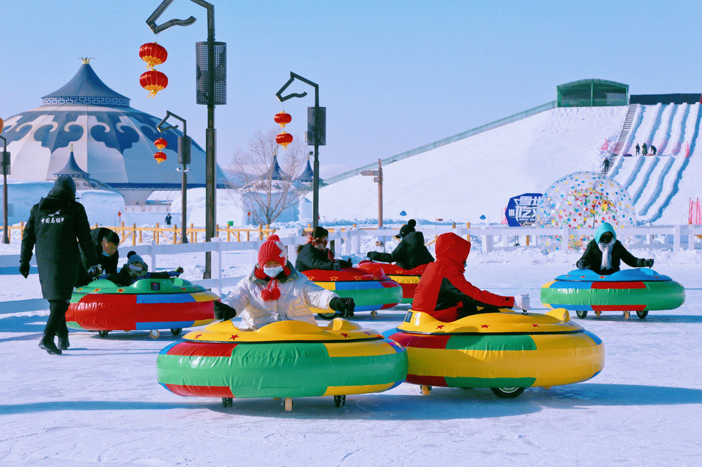 亲子雪地摩托、雪地坦克、雪圈、冰上碰碰车、冰上自行车……这片嬉雪世界充满了大人和孩子的欢笑声,让空气都变得不再那么寒冷。