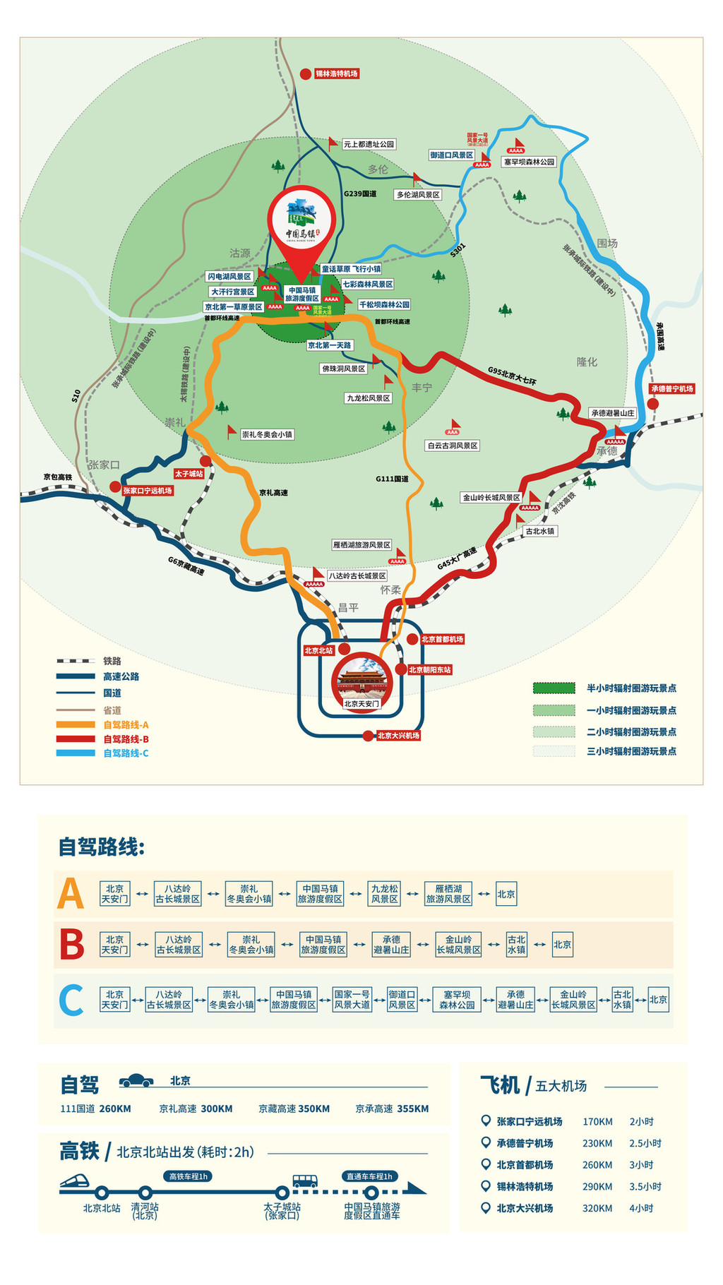 高铁:在北京北站/清河站乘车到太子城站,转乘中国马镇旅游度假区直通车,全程约2小时。