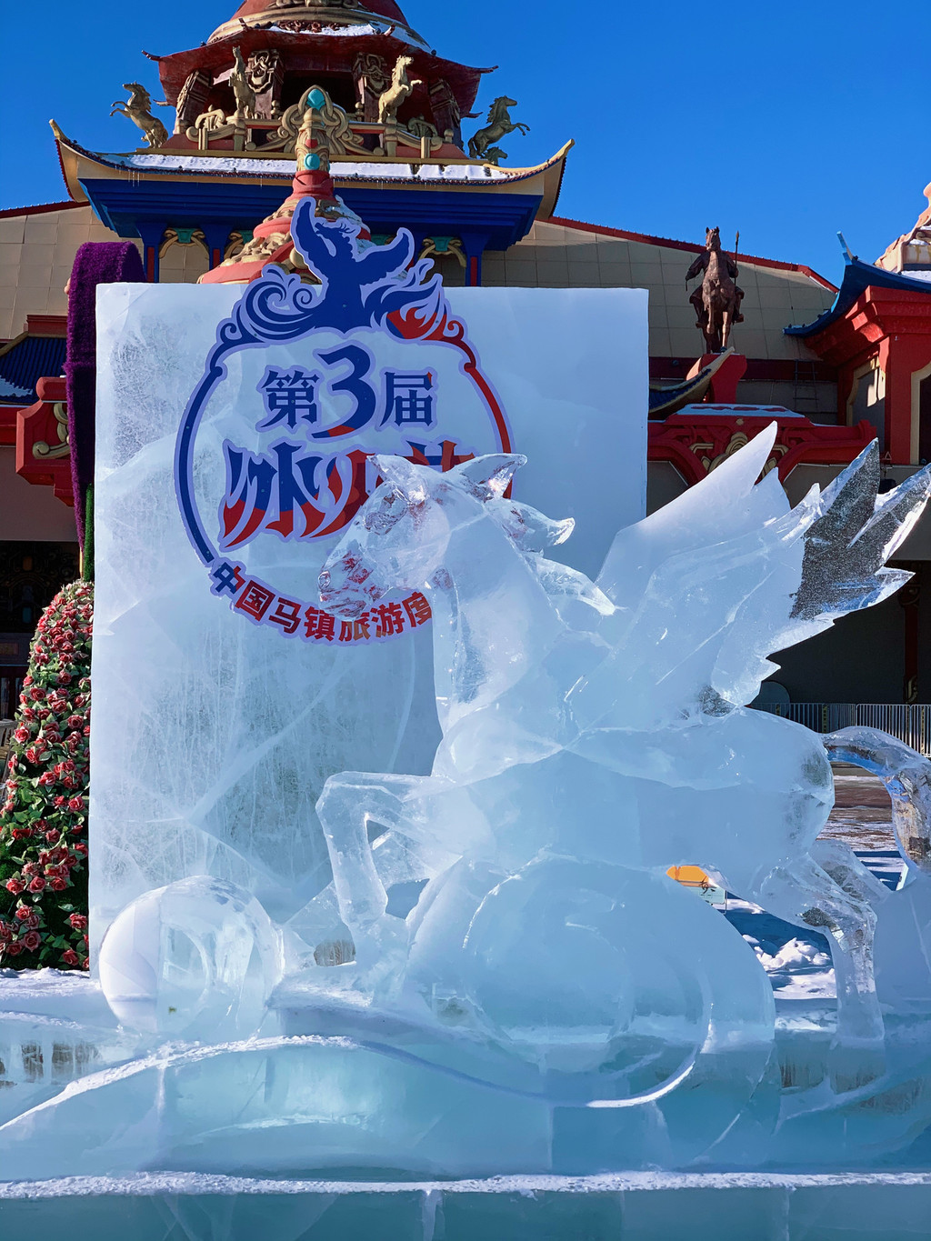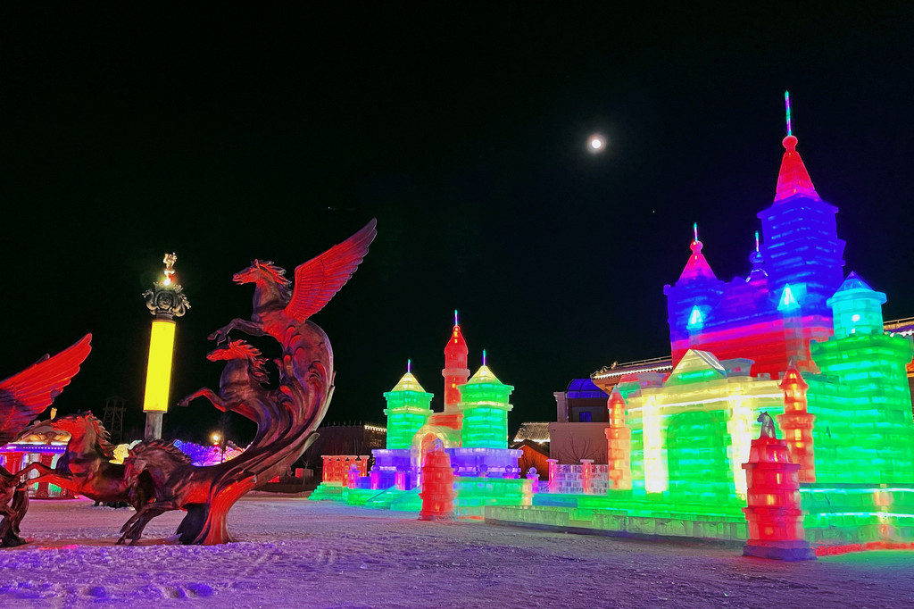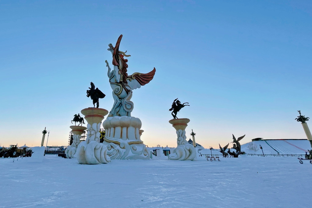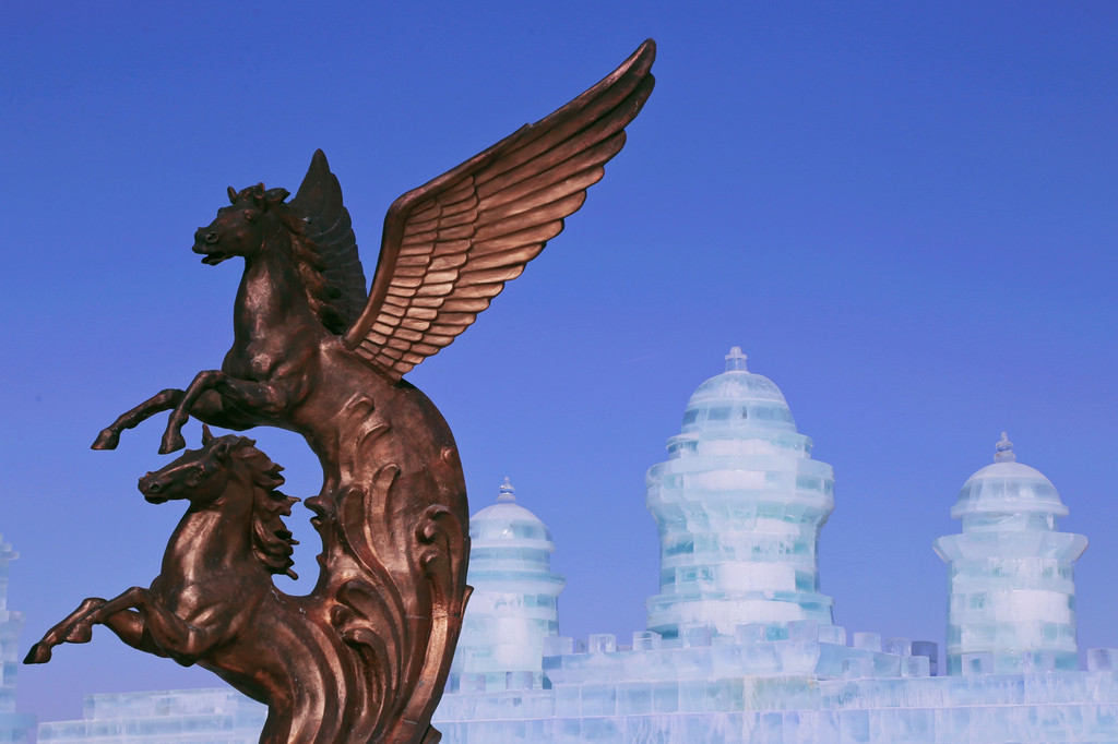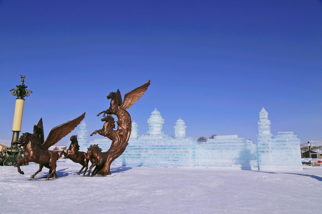 白天阳光微暖,冰雕折射出晶莹剔透的光芒,与广场上的骏马雕塑相得益彰,分外壮观。