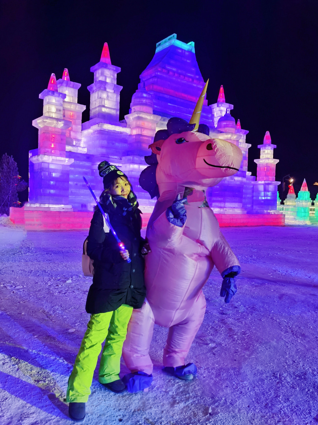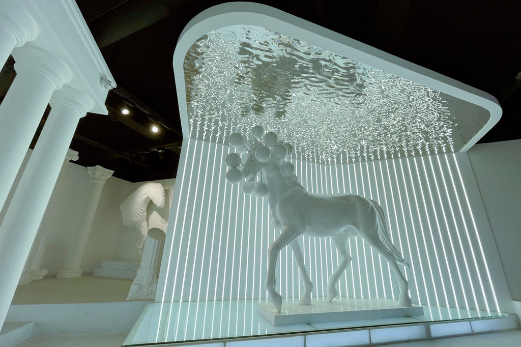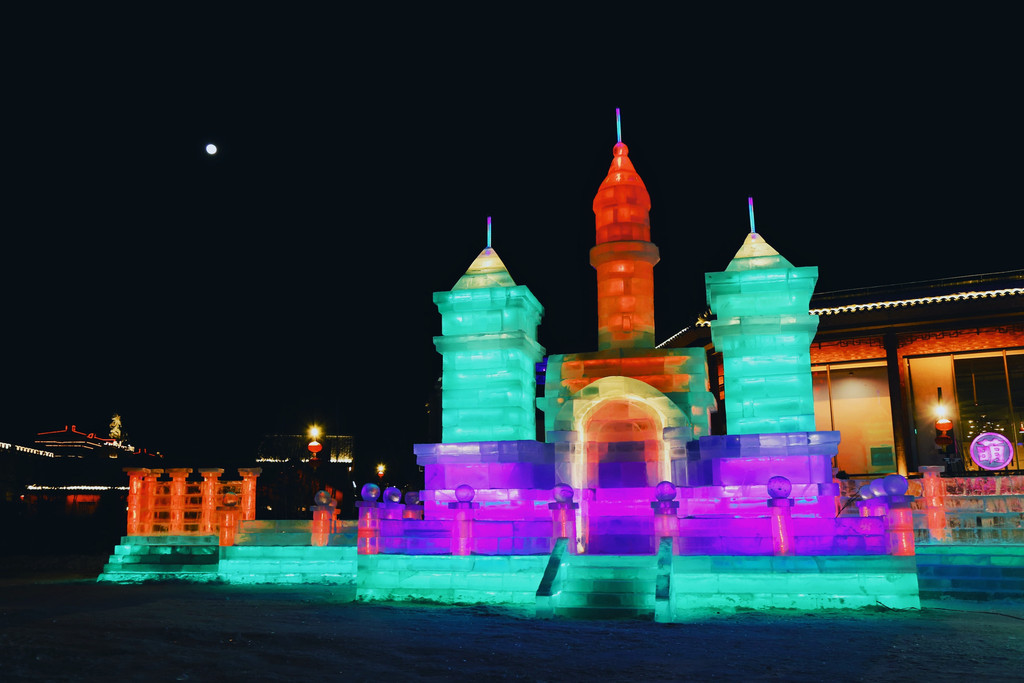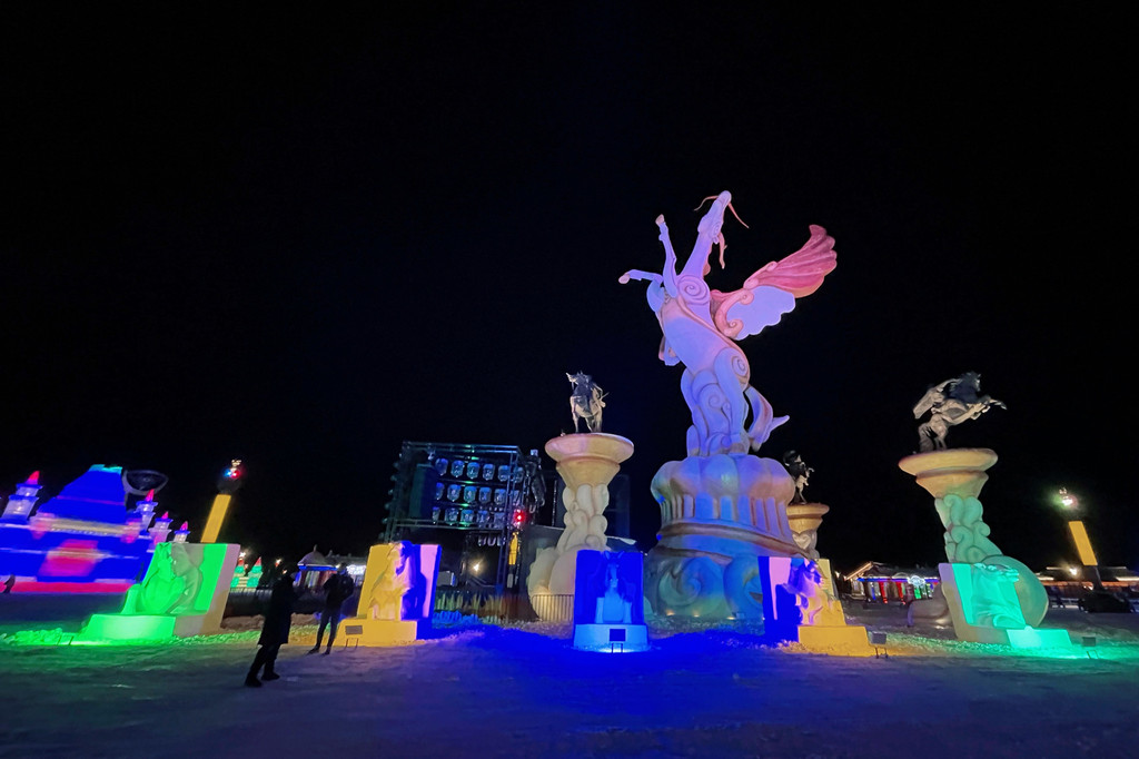 白天阳光微暖,冰雕折射出晶莹剔透的光芒,与广场上的骏马雕塑相得益彰,分外壮观。