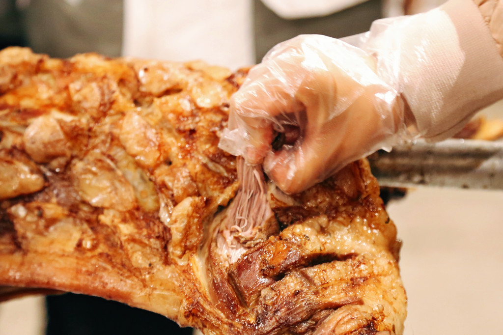 “贝勒爷”告诉我们,这里的烤羊讲究“一羊六吃”——吃羊皮、吃羊肉、吃羊排、吃羊腿、吃肉串、喝羊汤。