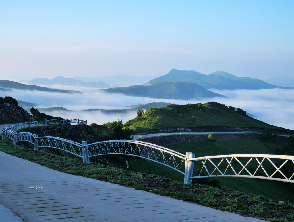 太阳一出,蓝天再现,云雾仿佛变成蓝色海洋,远处天路之上,连绵起伏的草原,蔚为壮观的云海,云蒸霞蔚仿佛仙境一般。
