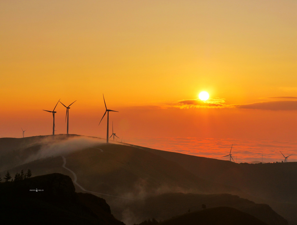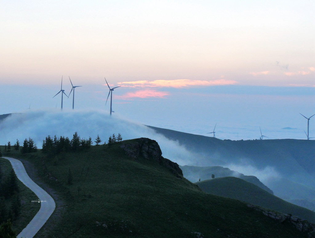 由于在山顶,风特别大,手感觉有些冷,看来穿厚衣服对了,眼前草原山脊上风车随风转动,这里是看日出的极佳位置。