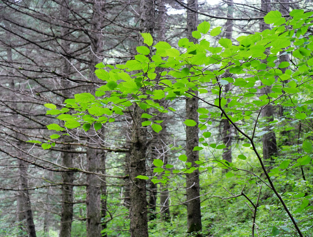 幽谷里树木繁多,高大挺拔,由于终年遮天蔽日,有些树枝变得干枯,并不影响树木生存,宽大的树冠,伸展的树根,有着顽强的生命力,树龄百年依旧有新长的绿叶。