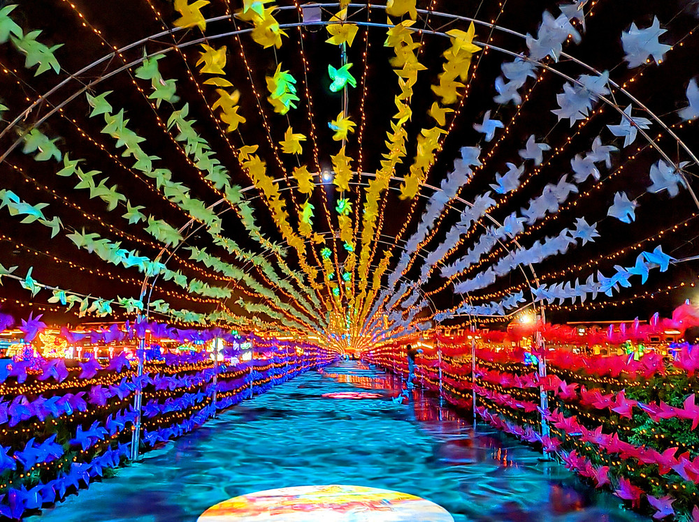 夜游童话草原别有一番情趣,被五颜六色动感十足的彩灯点缀下的景物,一切看着都与白天见到的景象反差十足,仿佛在梦幻世界中漫游。